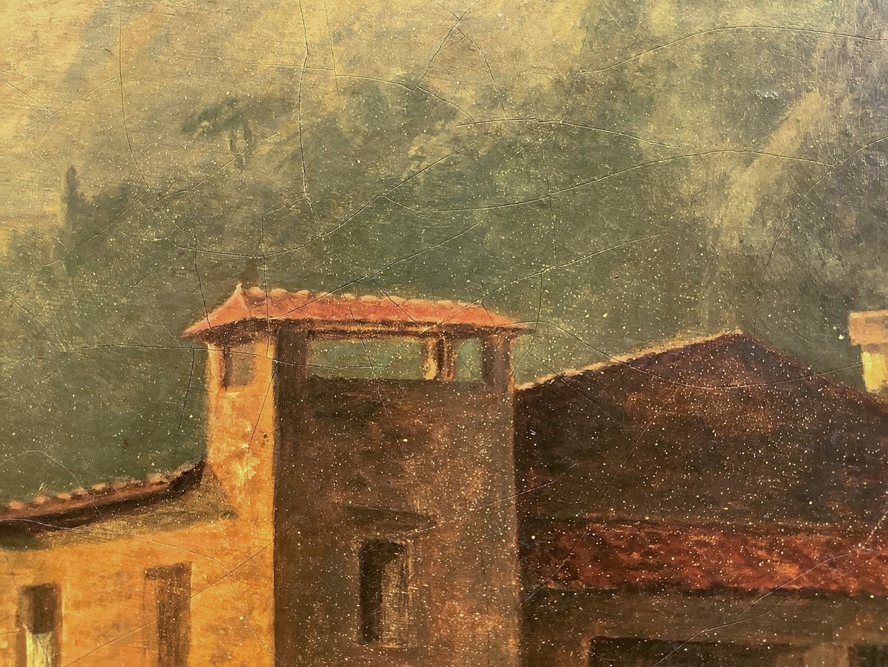 Paesaggio con casa e ponte, 19° Secolo Cm 38x46, in cornice cm 59x67,5 Dipinto ad olio su tela