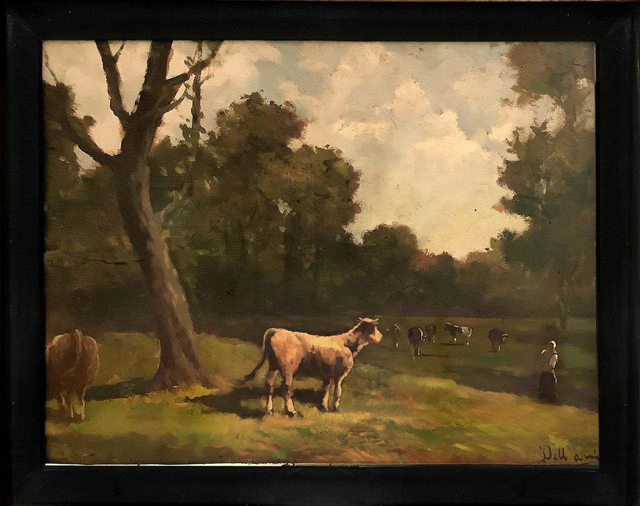 Lorenzo Delleani (Pollone 1840-Torino 1908) - Dipinto raffigurante scena bucolica con mucche su paesaggio, Inizi 20° Secolo