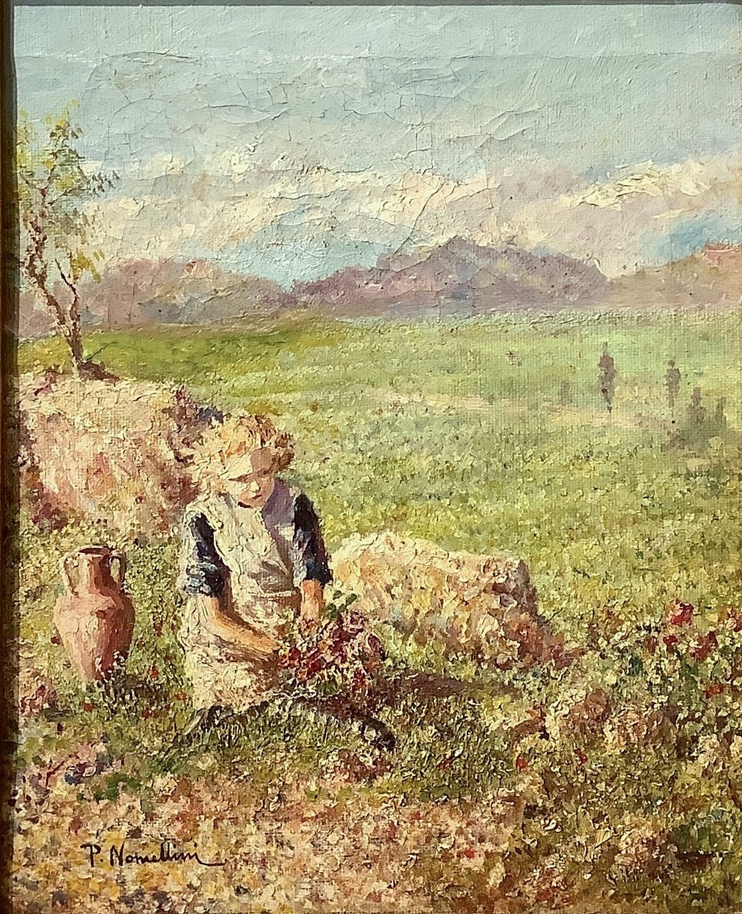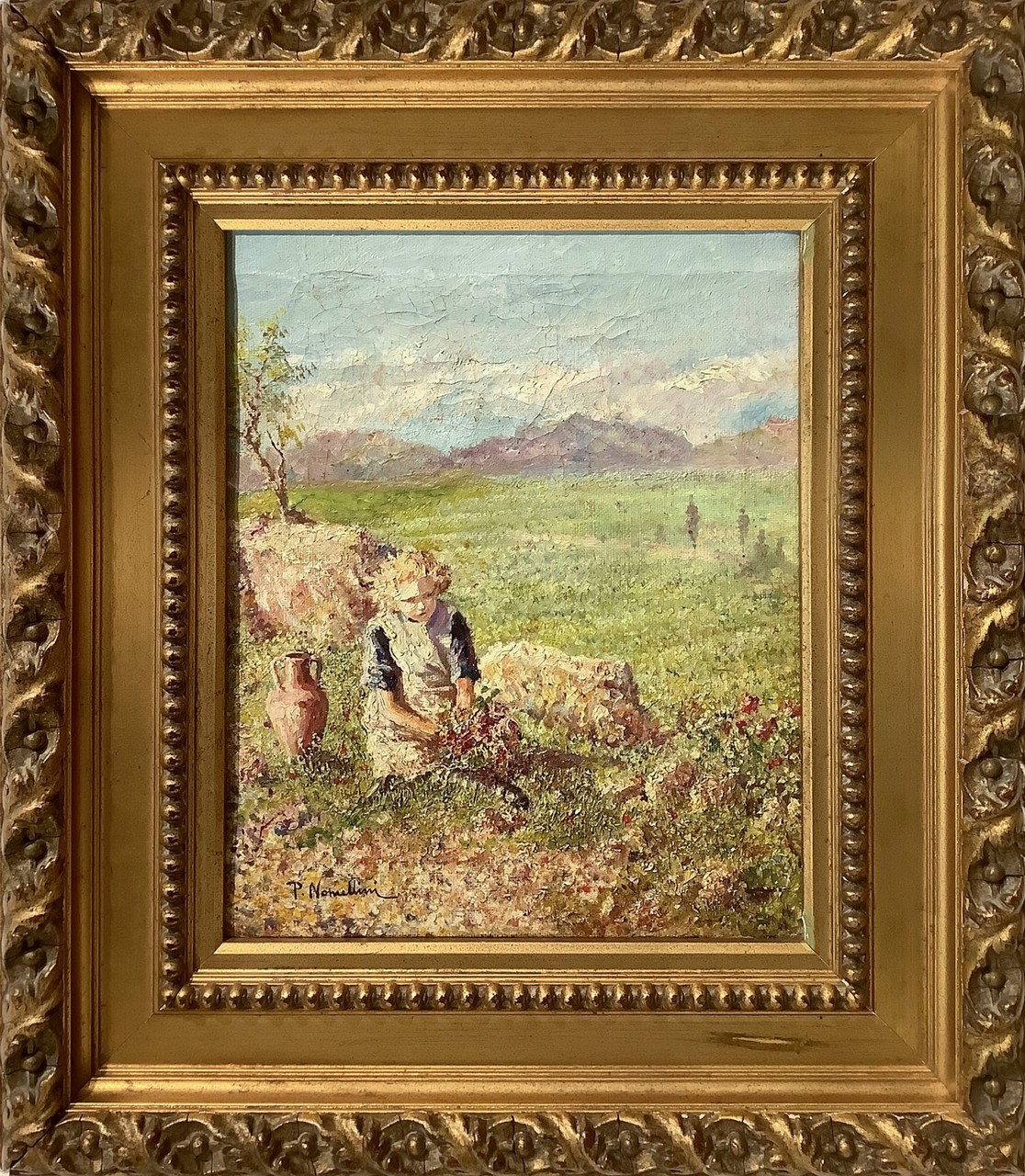 Plinio Nomellini (Livorno 6 agosto 1866-Firenze 8 agosto 1943) - Dipinto raffigurante "Paesaggio con figura di ragazza" , Fine 19° Secolo