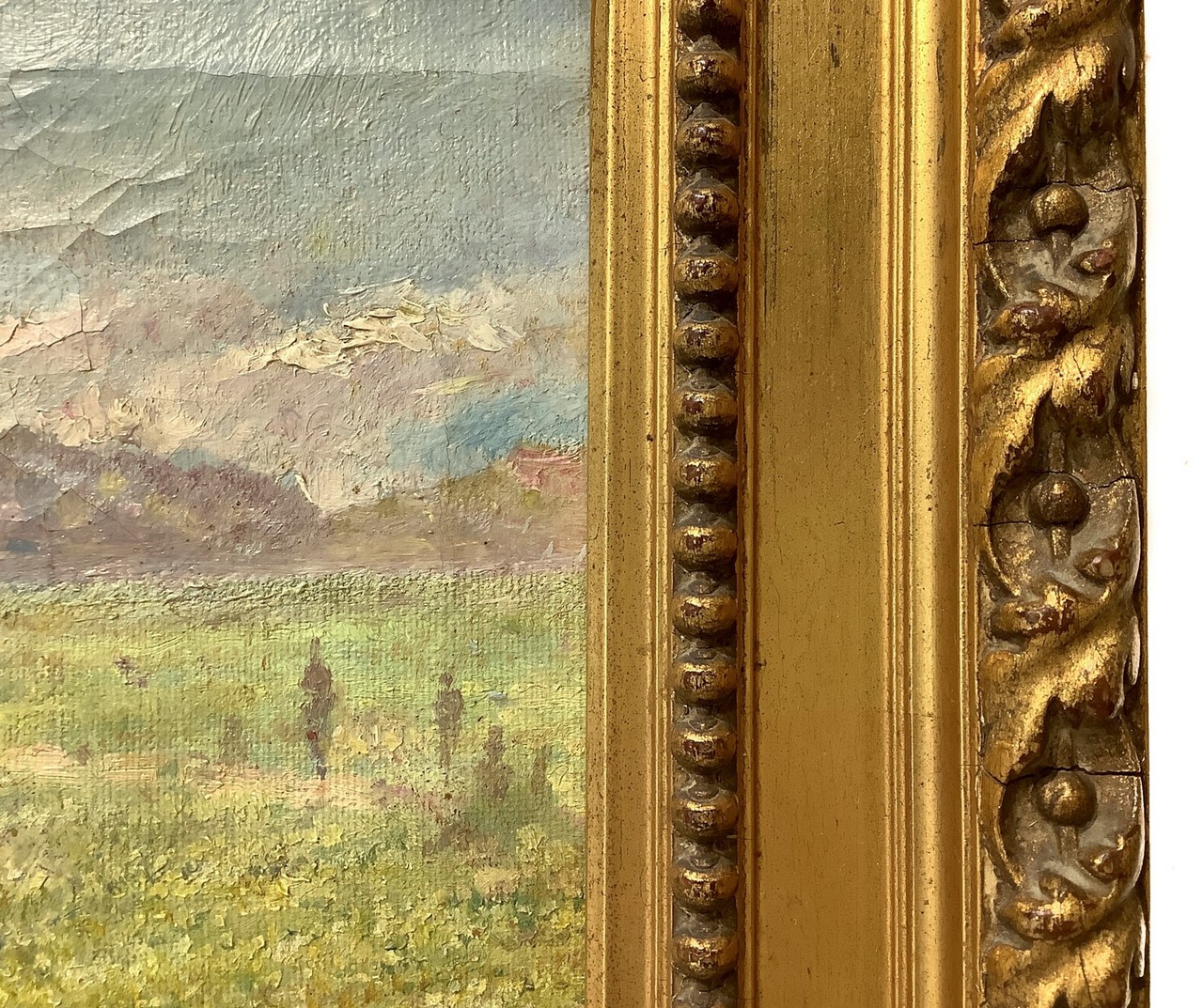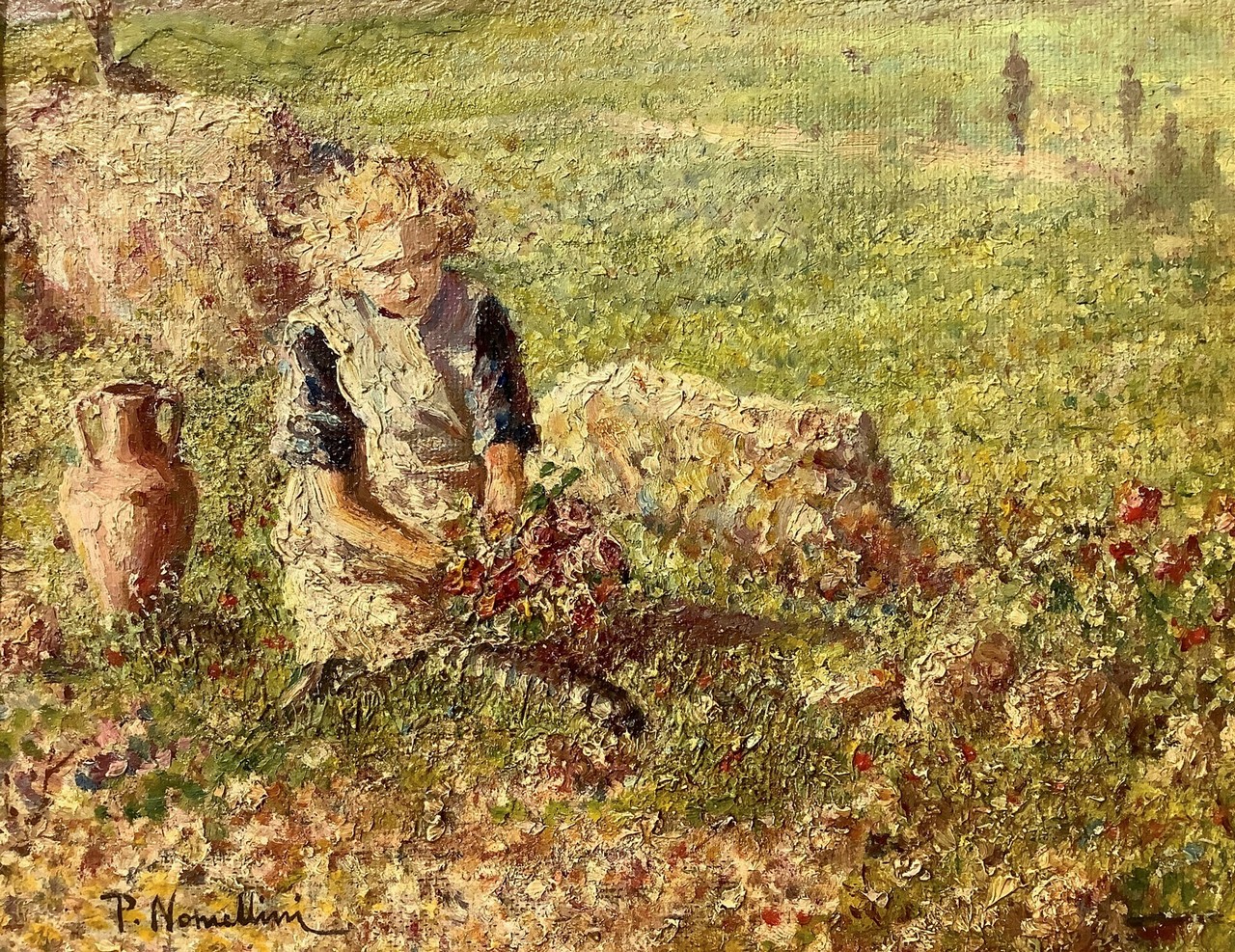 Plinio Nomellini (Livorno 6 agosto 1866-Firenze 8 agosto 1943) - Dipinto raffigurante "Paesaggio con figura di ragazza" , Fine 19° Secolo cm. 25 x 20, in cornice 37 x 32.5 Olio su tela