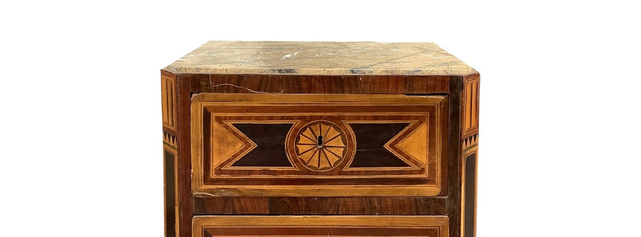 Piedi troncopiramidali a due cassetti, marmo al piano (sostituito); decori su cassetti e Finerali