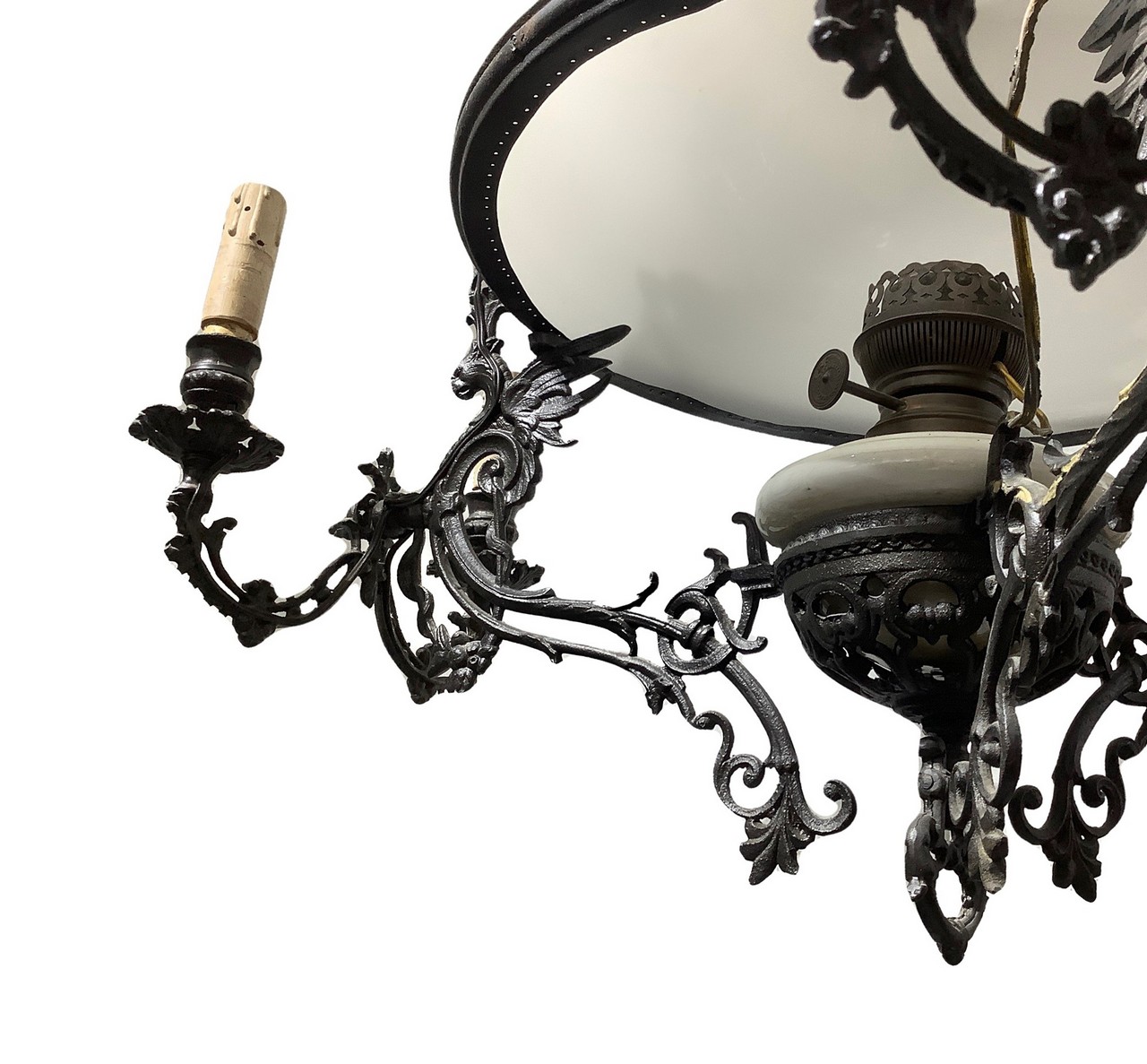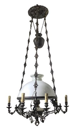 Lampadario in ottone con coppa in opaline di vetro. h cm 130x65 A 7 luci, da antica sospensione a petrolio della fine del XIX secolo.