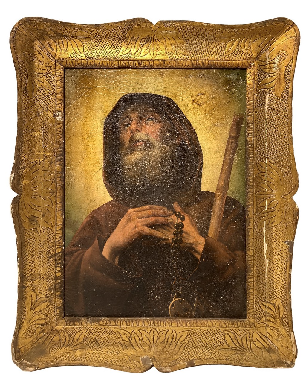 Dipinto raffigurante Sant'Antonio Abate con rosario, XVIII Secolo 59x46, in cornice 73x58 Olio su tela In cornice a vassoio del XIX Secolo; opera rintelata.