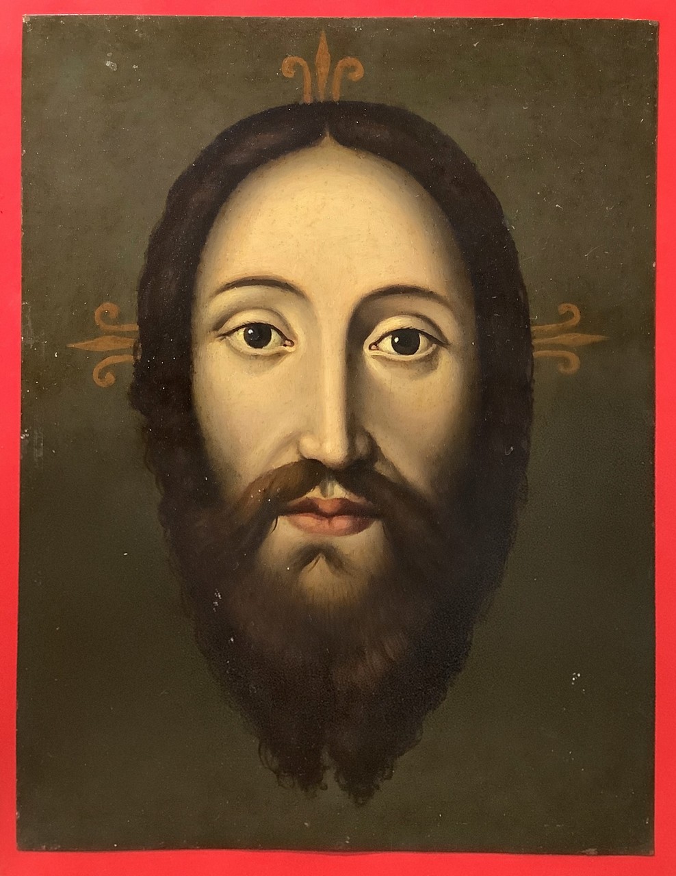 Dipinto raffigurante volto di Gesù in cornice di tartaruga antica, 19° Secolo