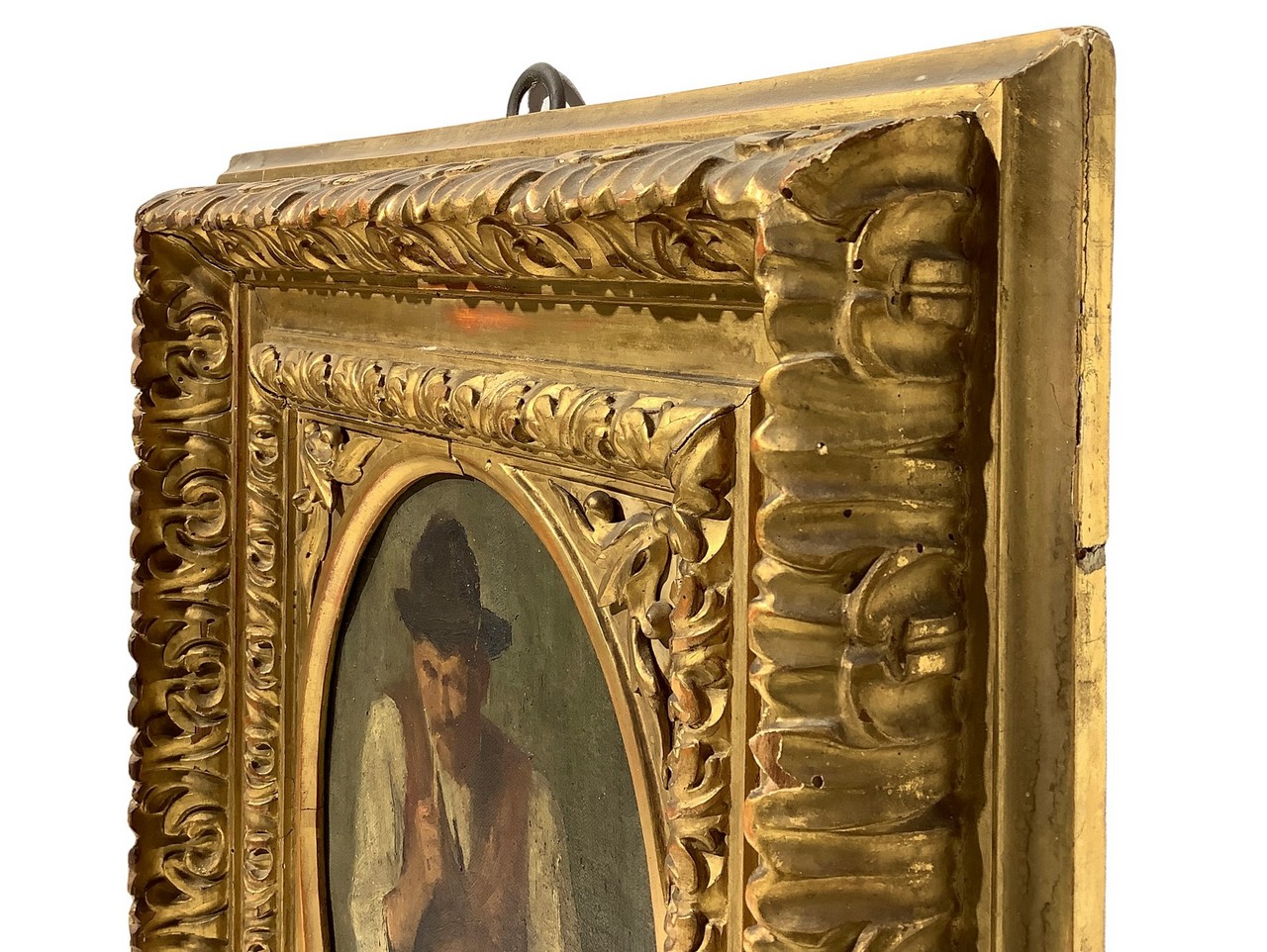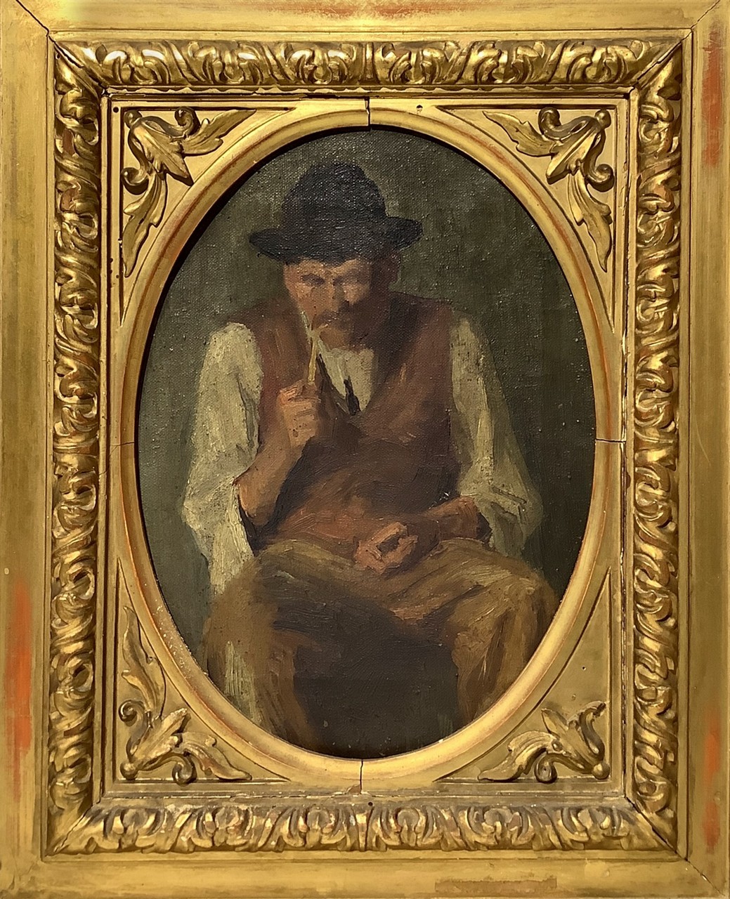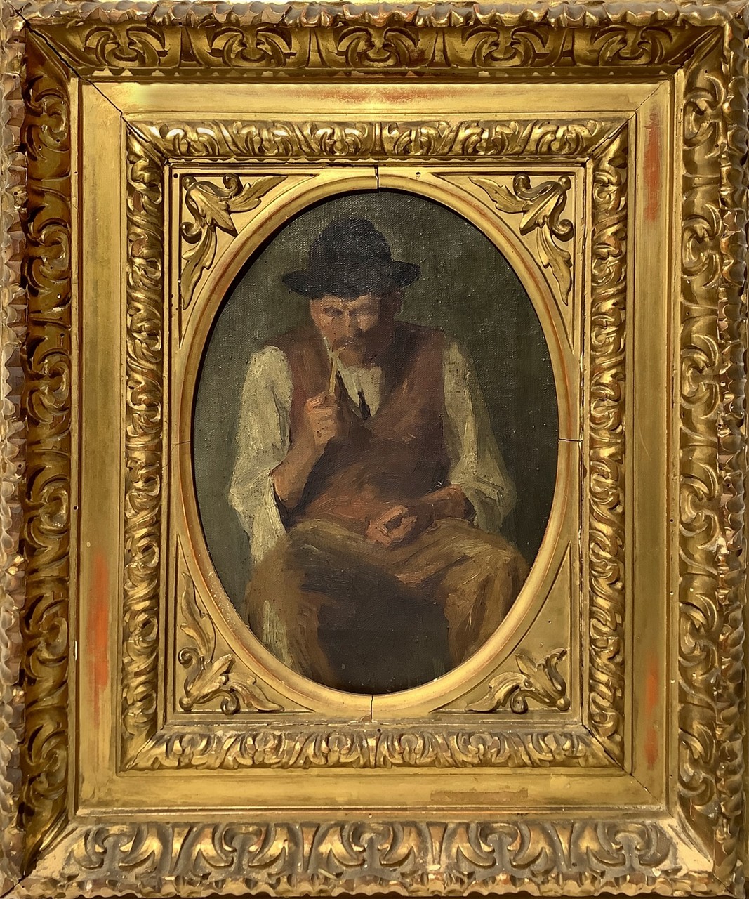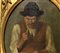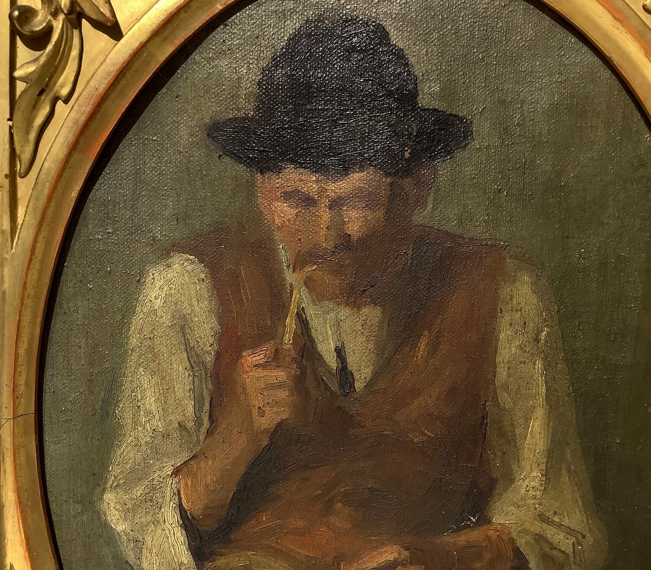 Uomo con cappello e pipa, Fine 19° Secolo cm 28x22, in cornice 49x41 Olio su tela In bella cornice di legno dorato.