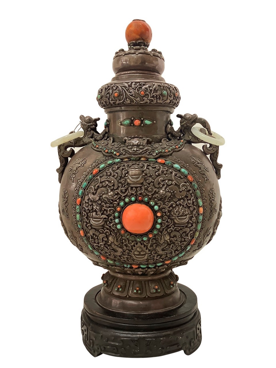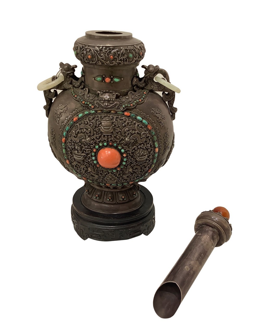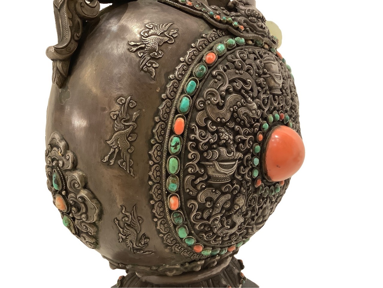 Antico incensiere mongolo in argento con decorazioni sbalzate e applicazioni di corallo, giada imperiale bianca, turchesi e corniole