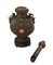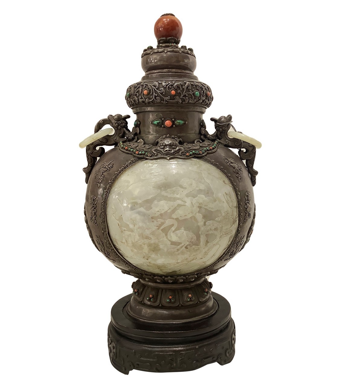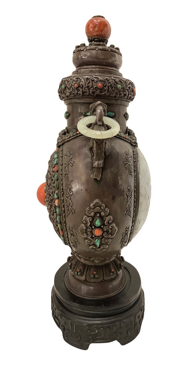 Antico incensiere mongolo in argento con decorazioni sbalzate e applicazioni di corallo, giada imperiale bianca, turchesi e corniole h cm 41x21 Sul retro grande placca di gyada imperiale sbalzata raffigurante paesaggio orientale con alberi e animali. Base in legno.