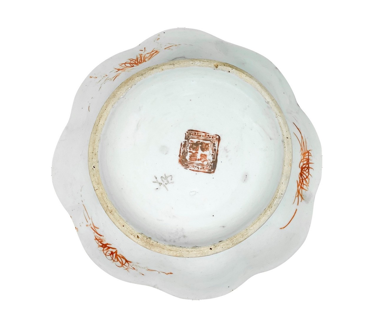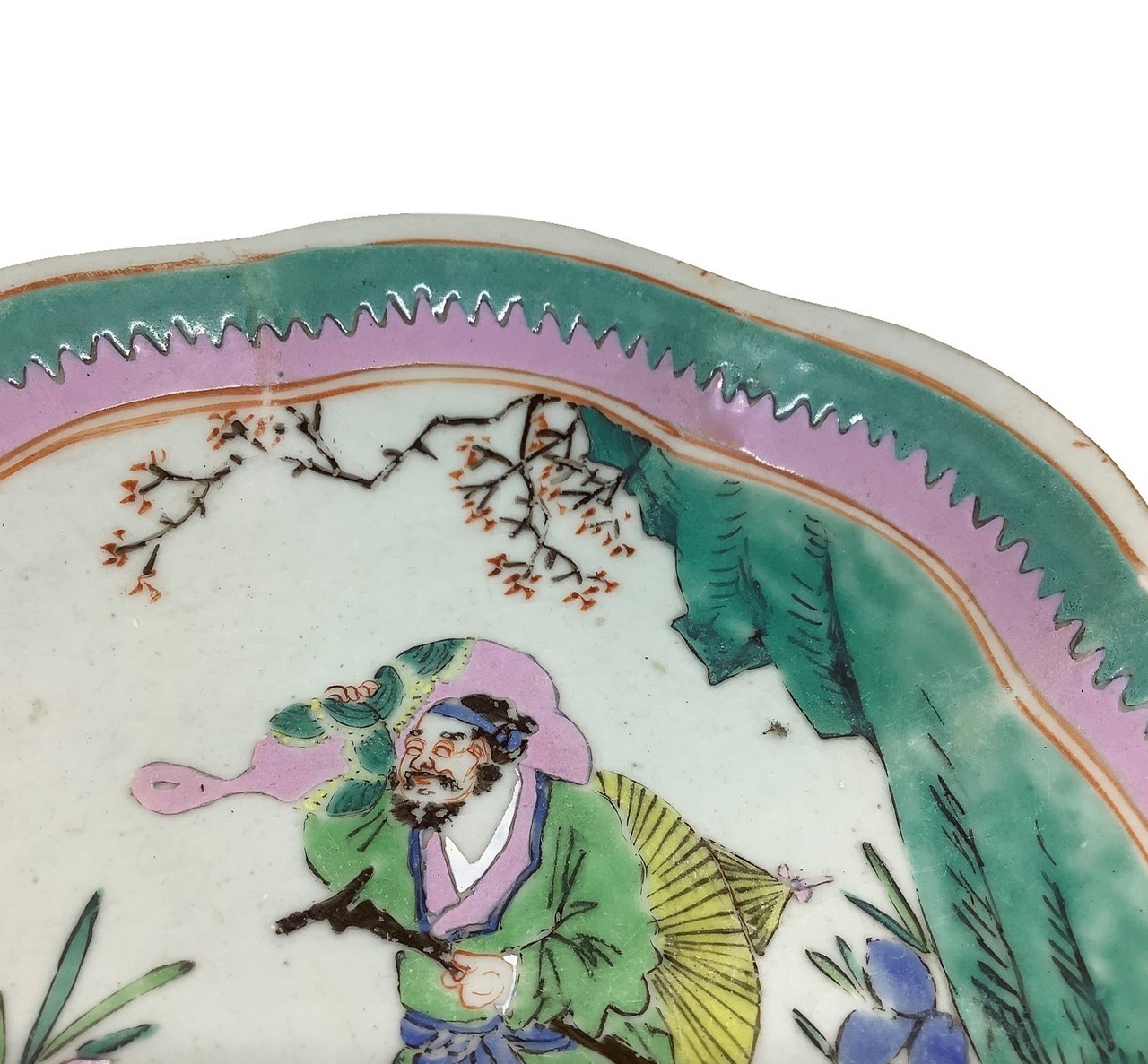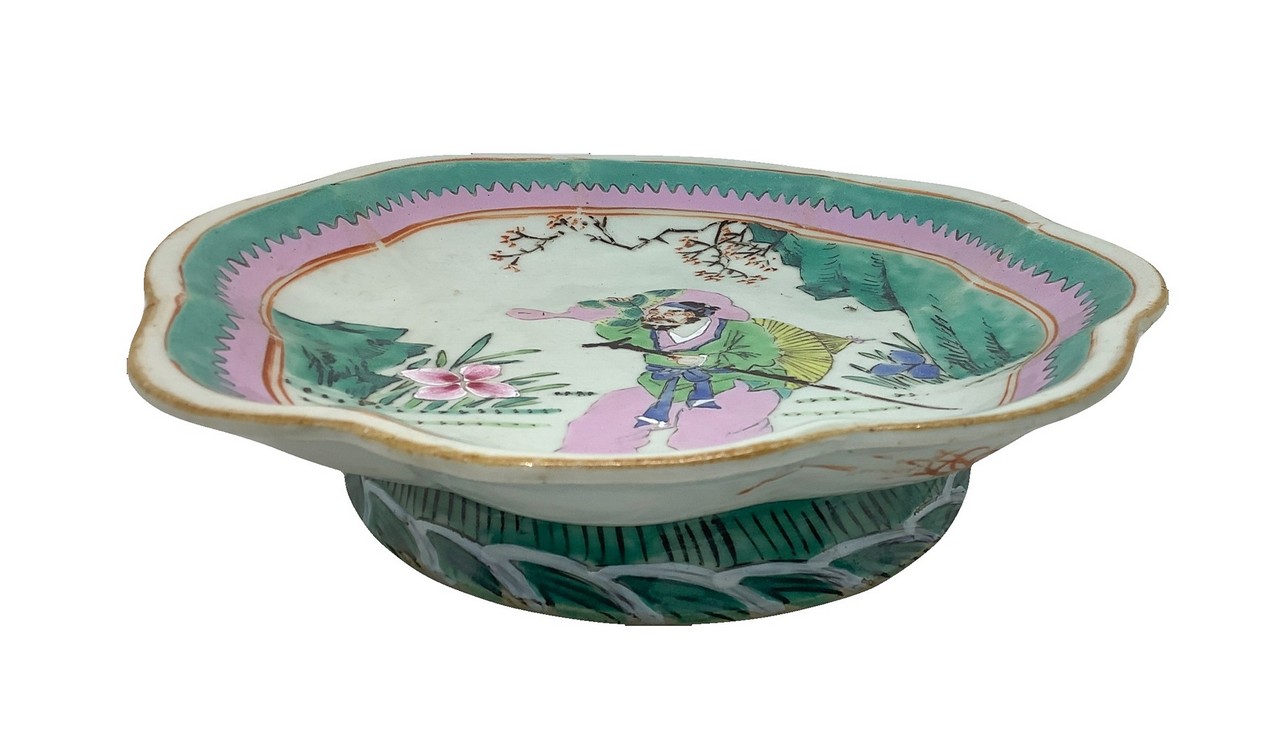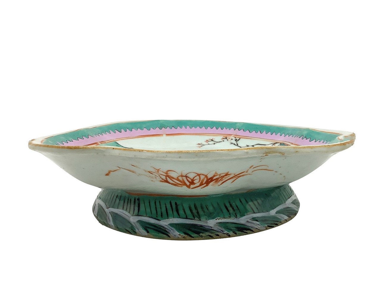 Piatto con figurazioni e motivi cinesi nei toni pastello con piccola alzatina, Fine 19° Secolo cm. 5 x cm. 21 Porcellana policroma dipinta a mano