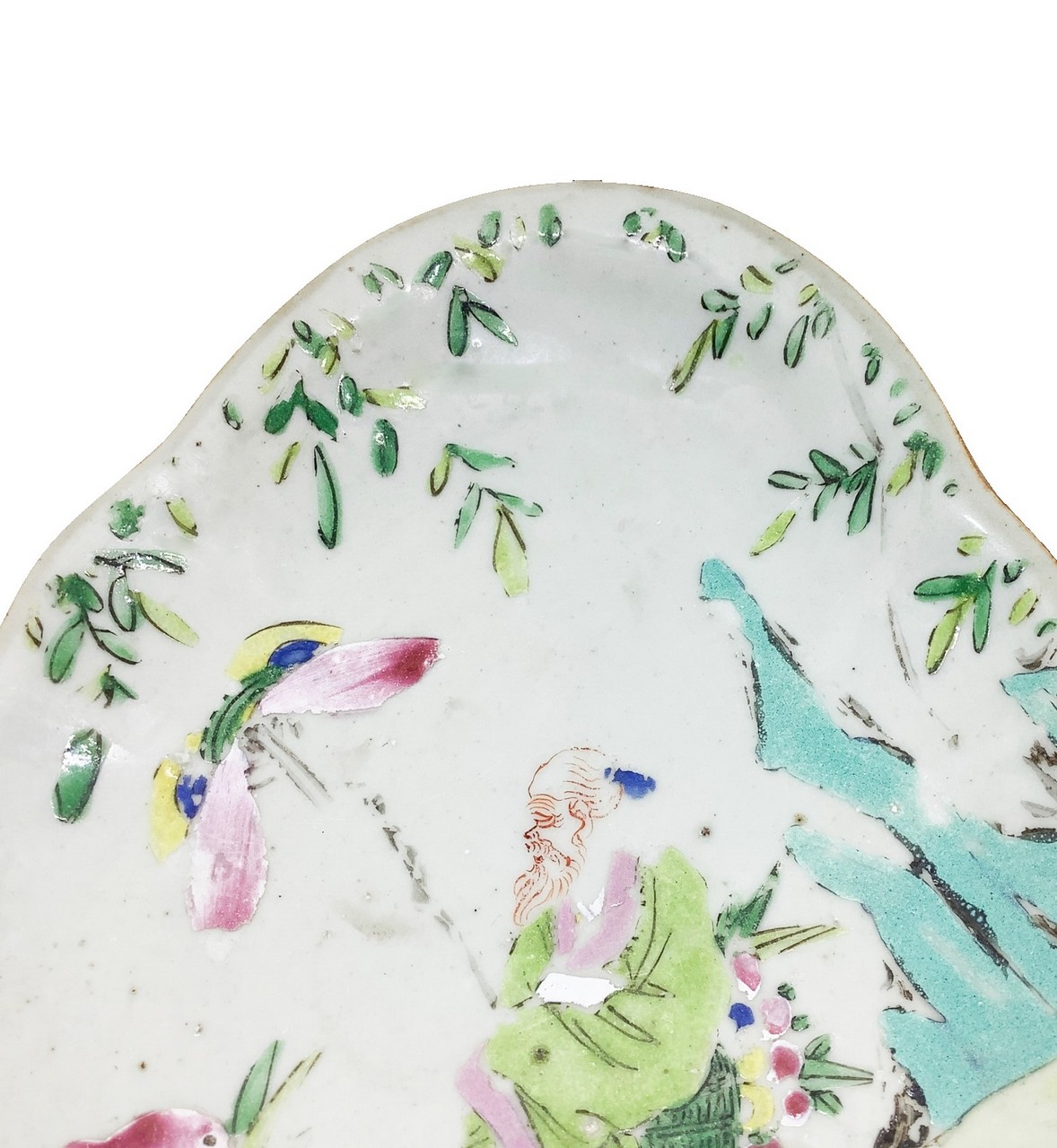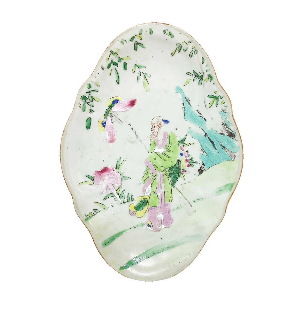 Piatto ovale con figurazioni e motivi cinesi nei toni pastello con piccola alzatina, Fine 19° Secolo
