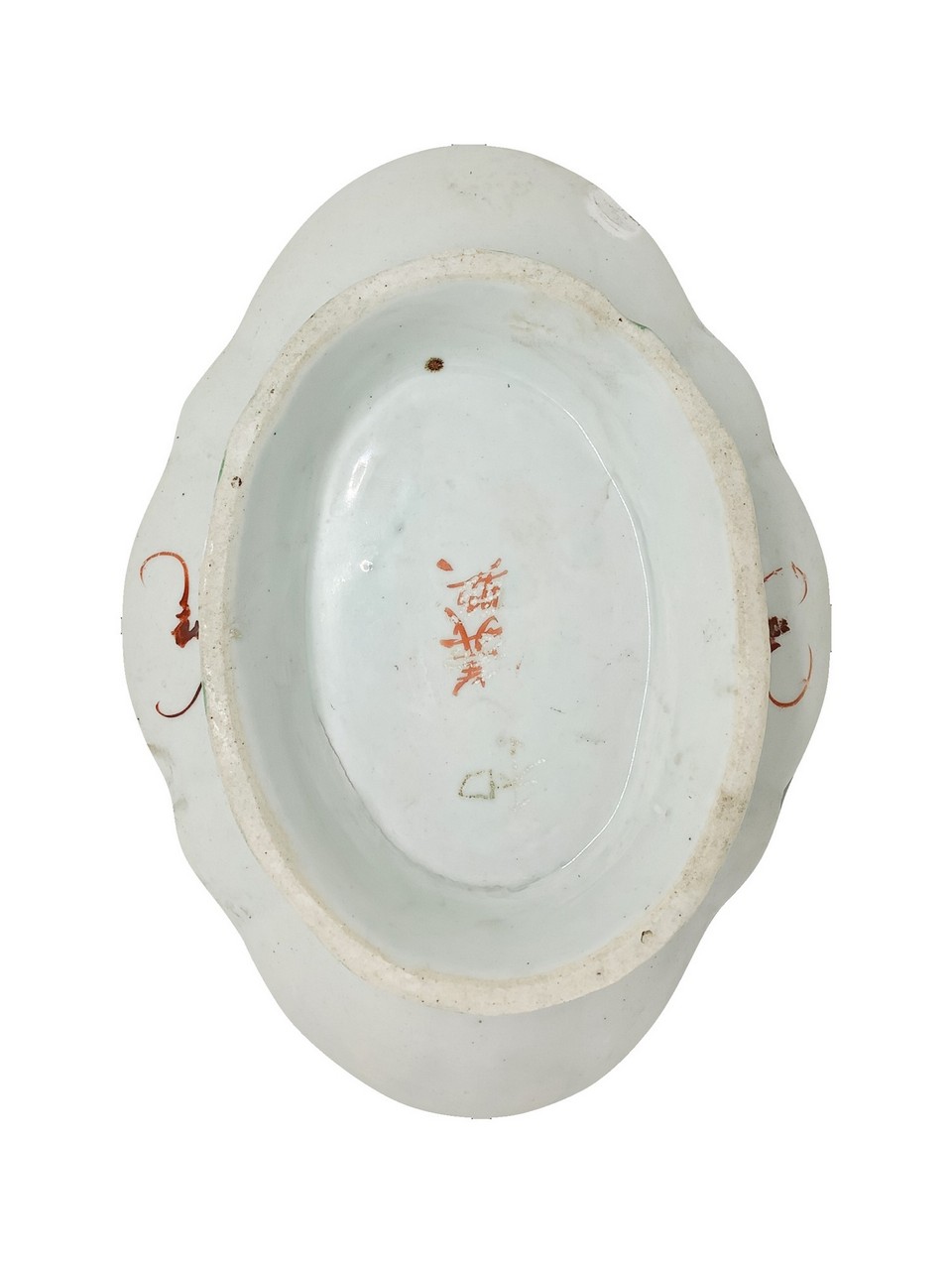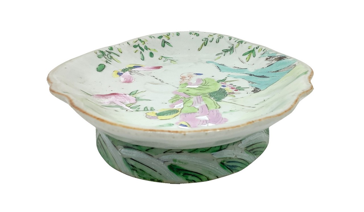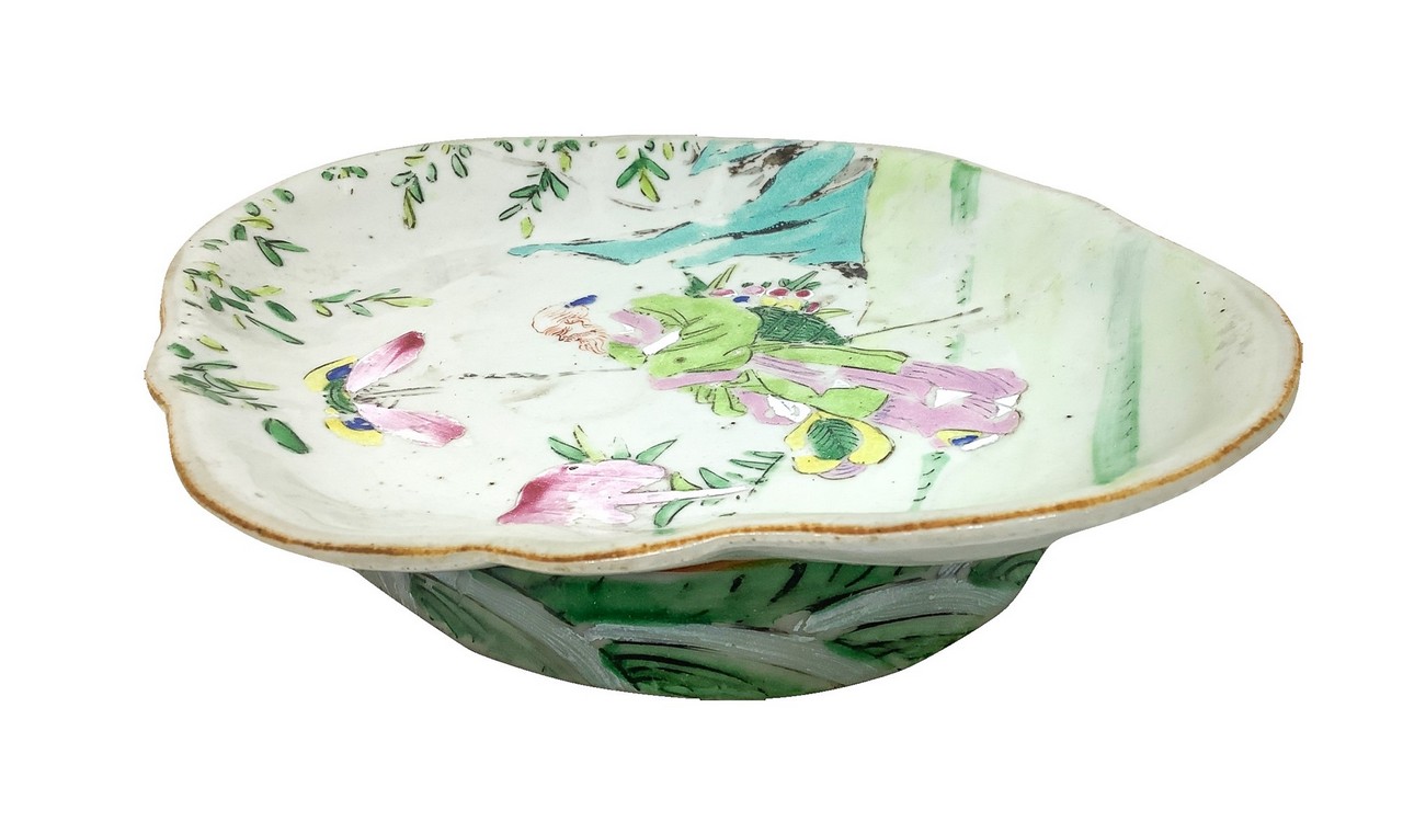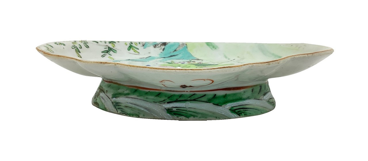 Piatto ovale con figurazioni e motivi cinesi nei toni pastello con piccola alzatina, Fine 19° Secolo cm. 4 x 16 x 22,2 Porcellana policroma dipinta a mano