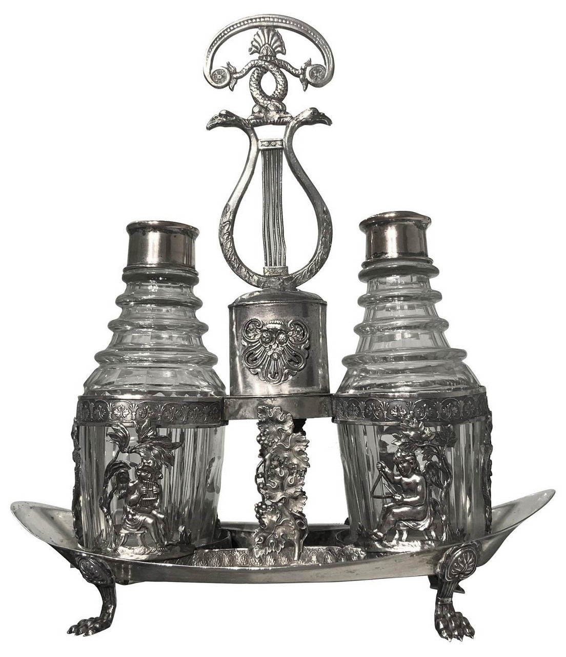 Saliera in argento, 19° Secolo H cm 27. Gr. 380 Saliera in argento con base ovale poggiante su piedi a zampa felina. Porta ampolle sostenuti da cherubini.