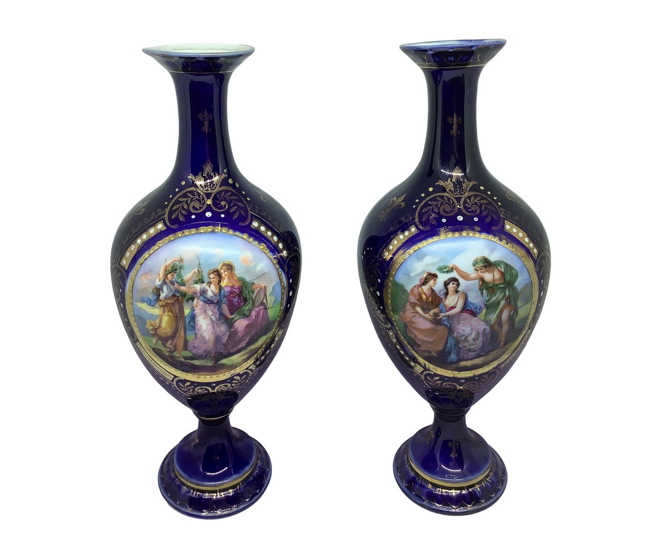 Coppia di vasi in porcellana francese con decorazioni in oro, smalti e medaglioni dipinti sul fronte con scene di genere, 20° Secolo
