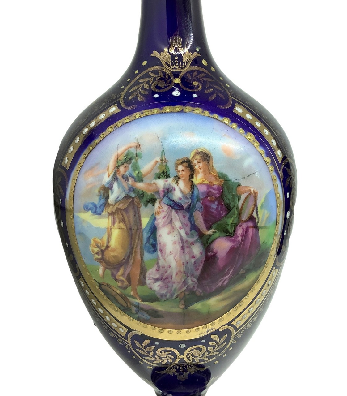 Coppia di vasi in porcellana francese con decorazioni in oro, smalti e medaglioni dipinti sul fronte con scene di genere, 20° Secolo H cm 27 Minima filatura