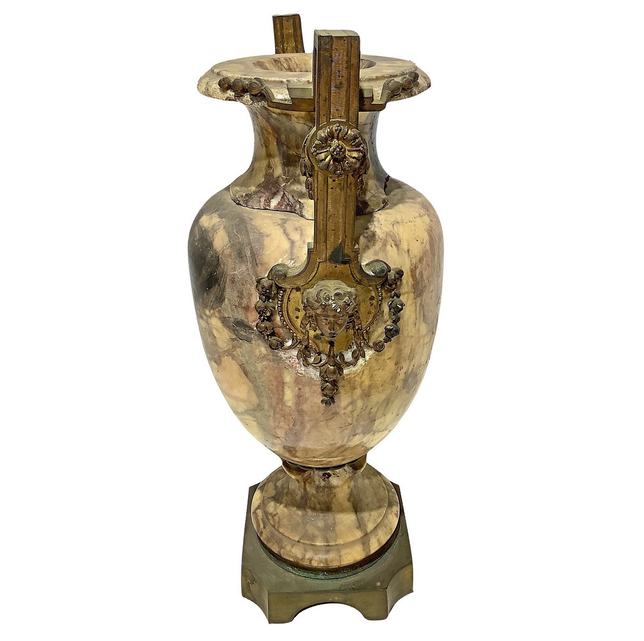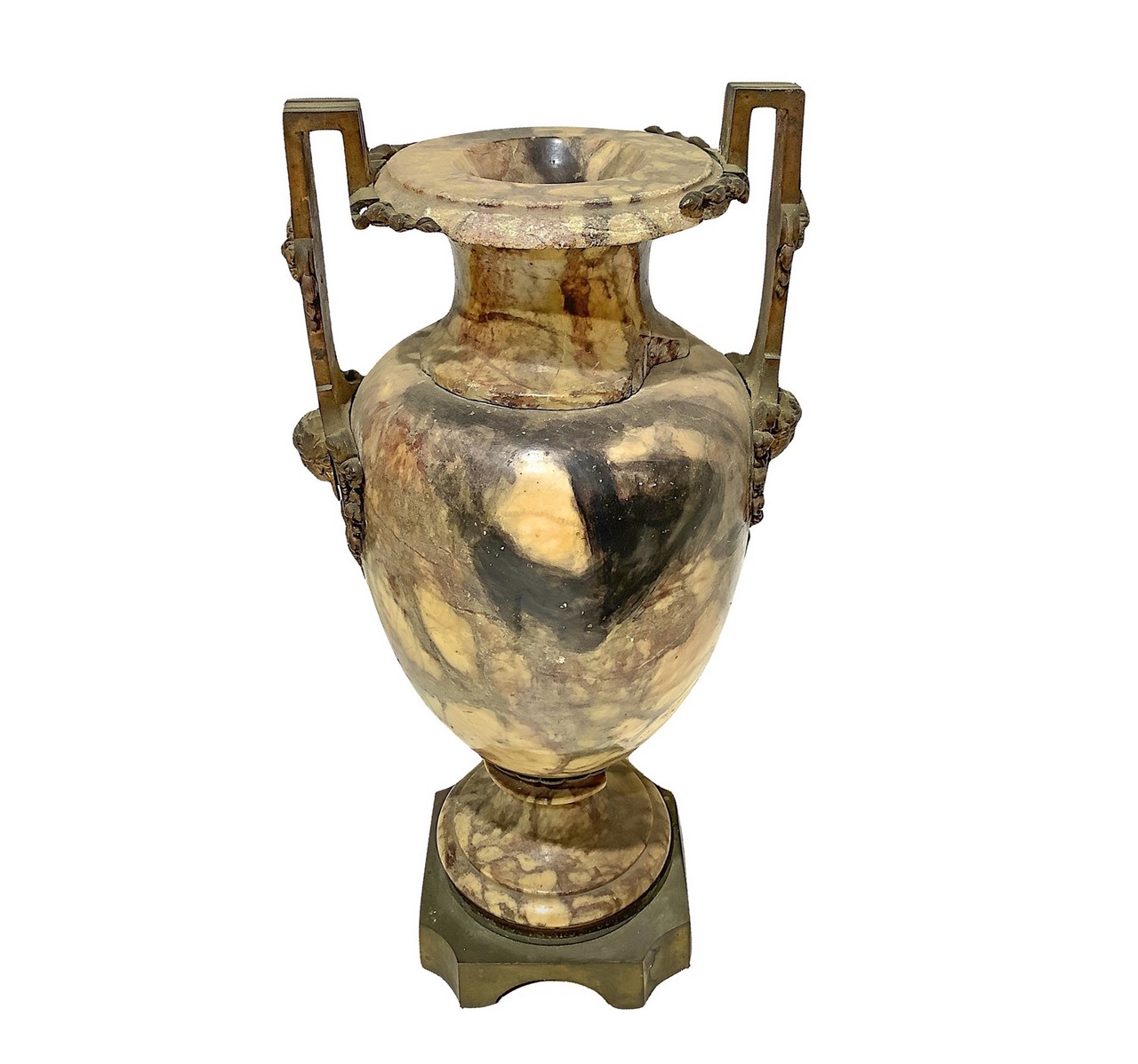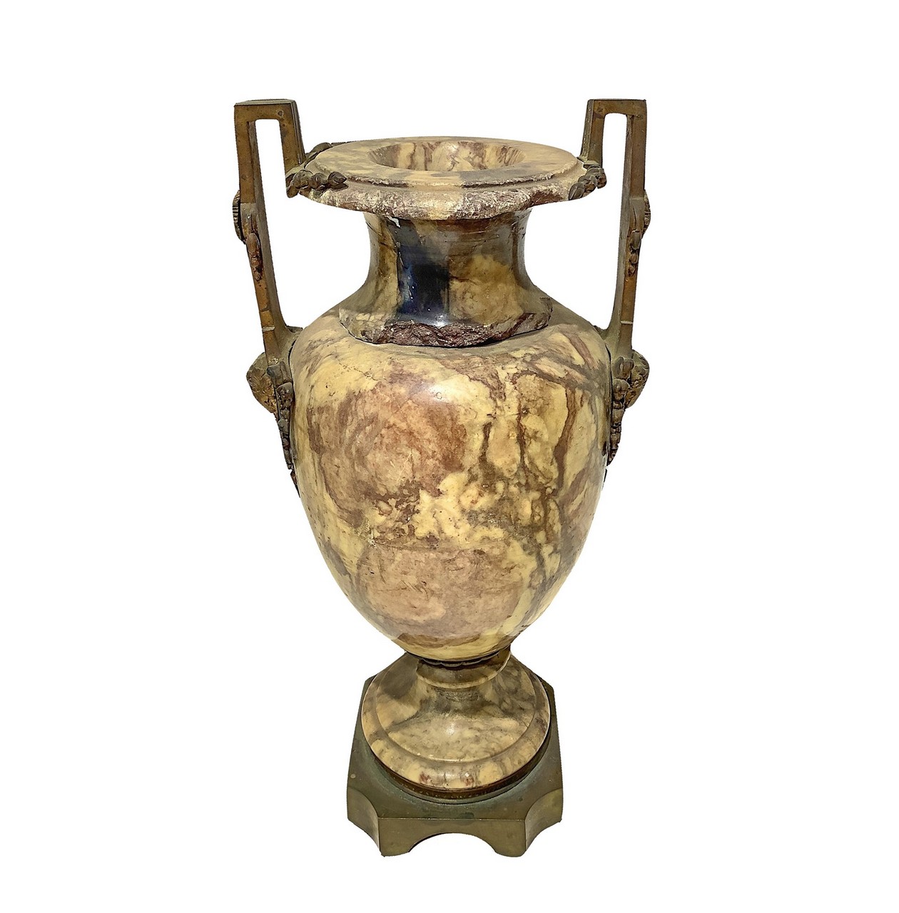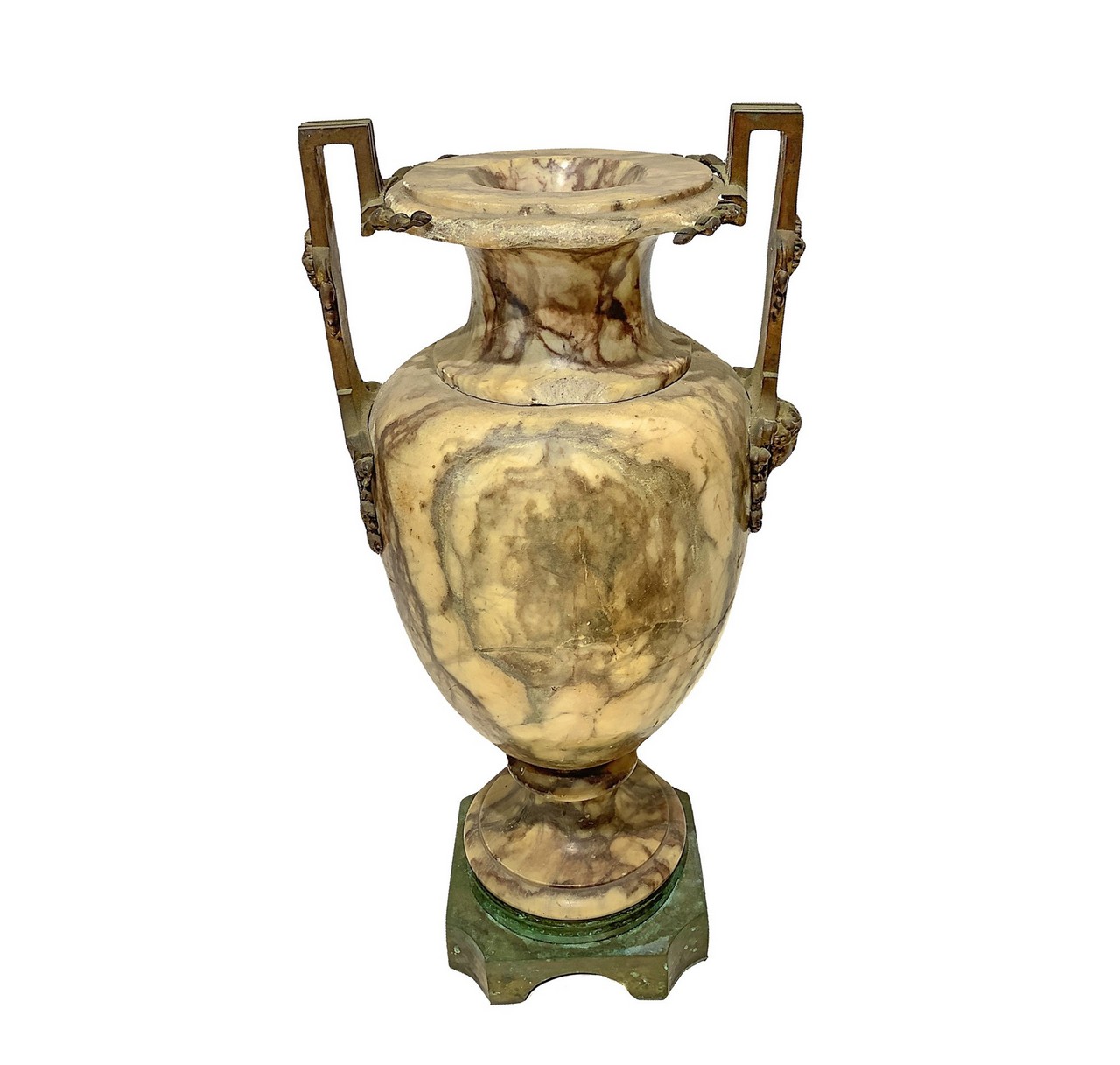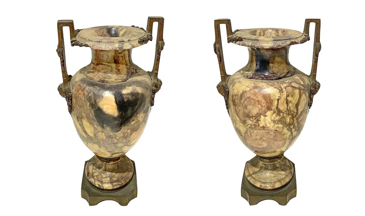 Coppia di vasi in alabastro stile deco con manici in bronzo., Inizi 20° Secolo