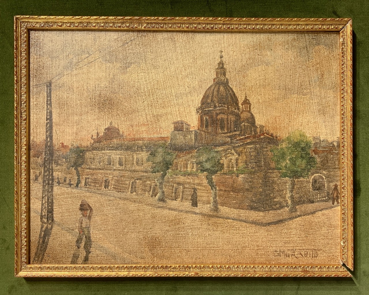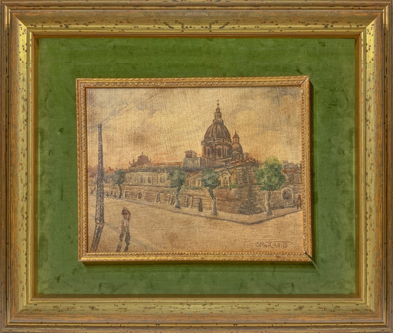 Cupola di Sant'Agata e dintorni, 20° Secolo 32x42 cm, in cornice 61x72 cm Olio su masonite Firmato in basso a  destra, autore G.Murabito