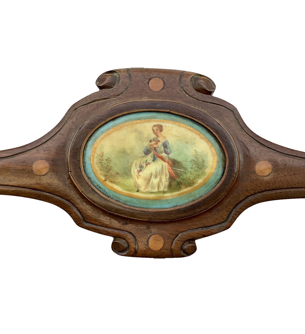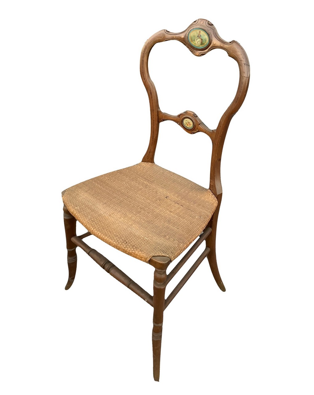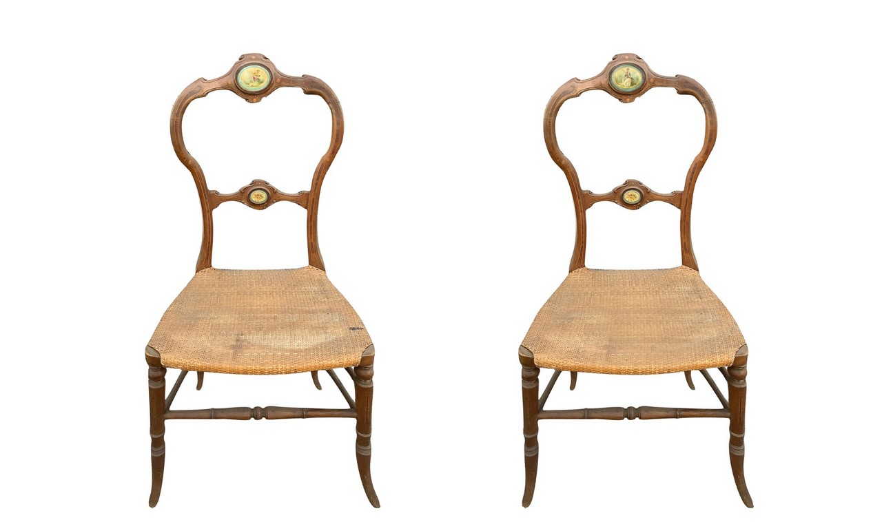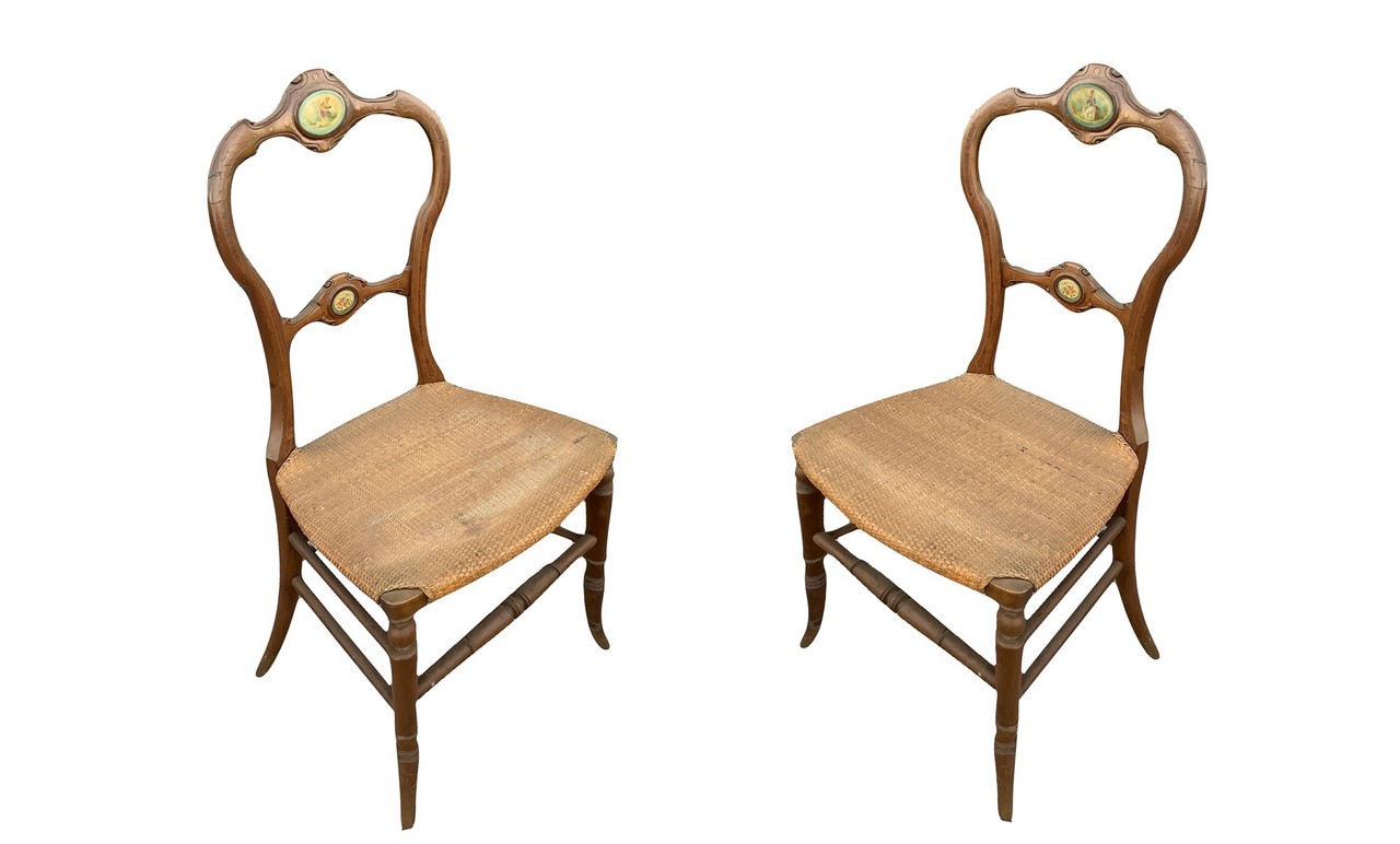 Coppia di sedie in legno, seduta e tamburo in paglia di Vienna. Spalliere con 2 miniature raffiguranti scene di genere, Fine 19° Secolo