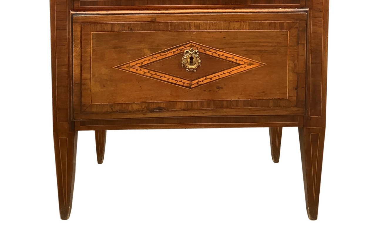 Comodino a due cassetti tardo Luigi XVI in legno di noce con losanghe al fronte, al piano e ai lati e piedi tronco piramidali, 19° Secolo