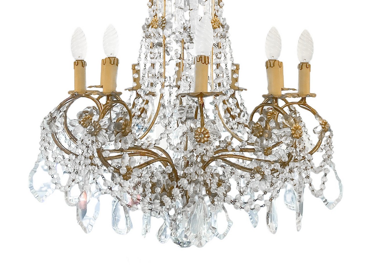 Coppia di lampadari in metallo, con brindoli di vetro, Inizi 20° Secolo