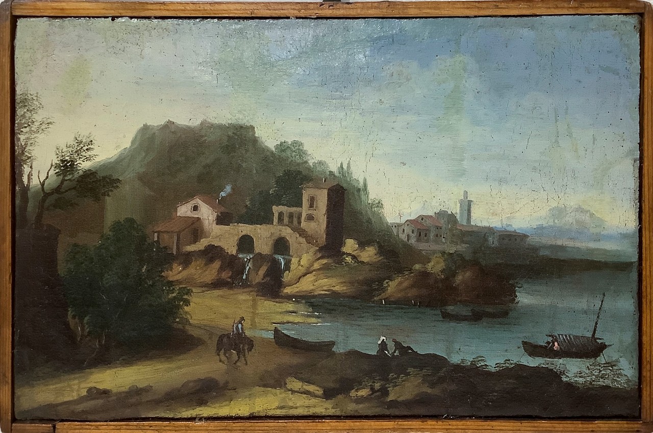 Giuseppe Zais (ambito di) (Forno di Canale 22/03/1709-Treviso 29/12/1781) - Paesaggio con case, barche e personaggi, XVIII Secolo cm 19,5 x 29,5 Olio su tela