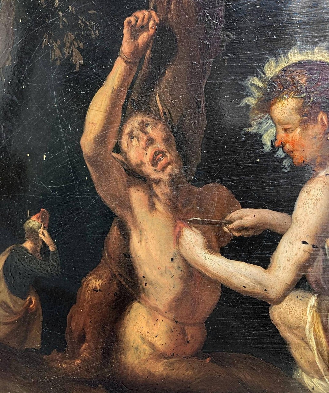 Apollo che scuoia Marsia CM 29X32, IN CORNICE CM 40X42. SPESSORE MM 10. Dipinto ad olio su ardesia ATTRIBUITO A PIERO DI COSIMO (FIRENZE, 1461 CIRCA – FIRENZE, 12 APRILE 1522). PICCOLA INCOLLATURA NELL'ANGOLO IN ALTO A SINISTRA. IL DIPINTO È ATTRIBUITO ORALMENTE AL PITTORE PIERO DI LORENZO DI CHIMENTI, CONOSCIUTO COME PIERO DI COSIMO, ALLIEVO DI COSIMO ROSSELLI, ATTIVO A FIRENZE E ROMA DOVE, TRA IL 1481 E L'82, LAVORÒ AGLI AFFRESCHI DELLA CAPPELLA SISTINA. POICHÈ NON ESISTONO