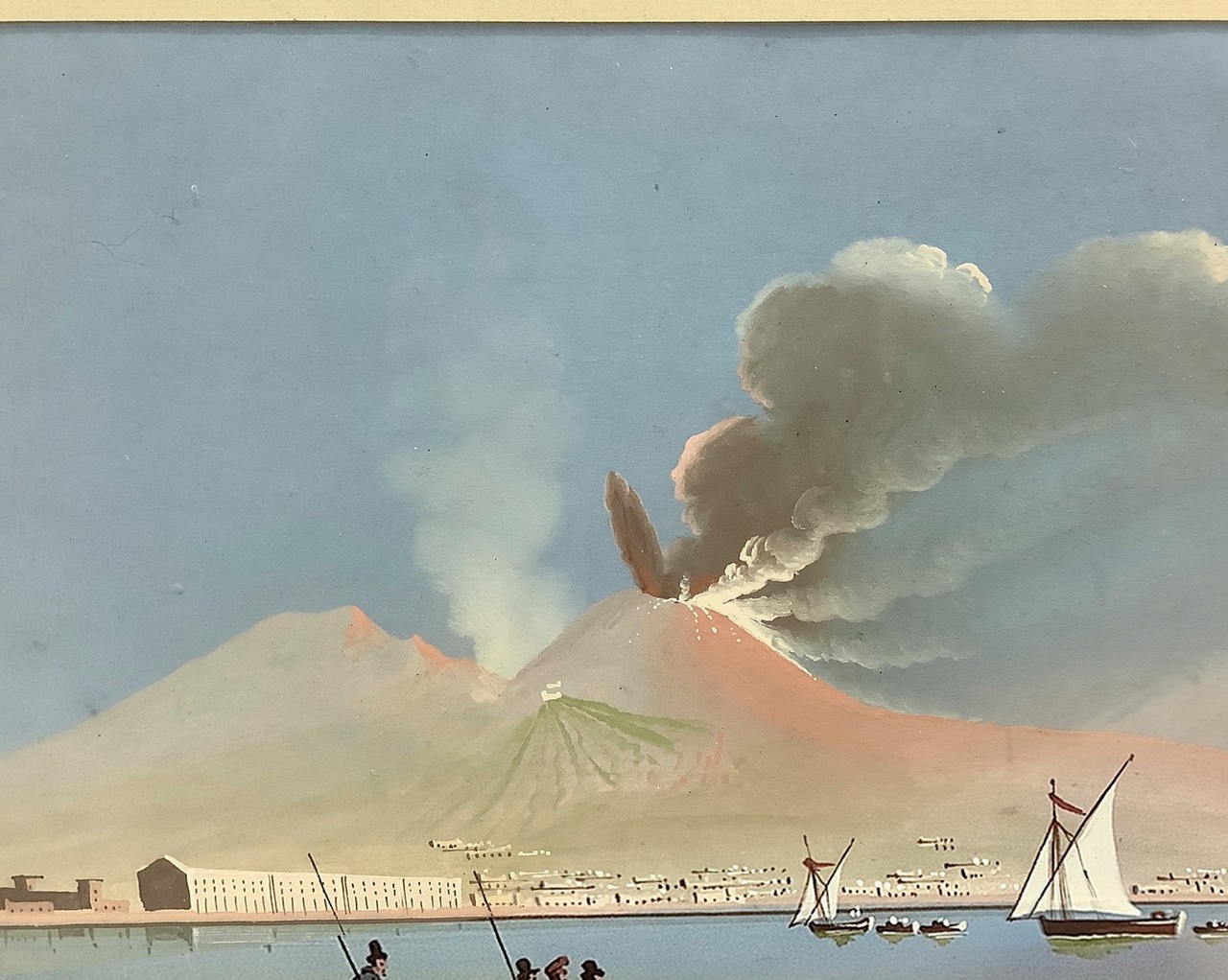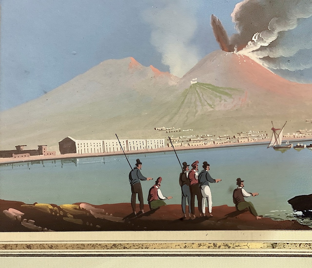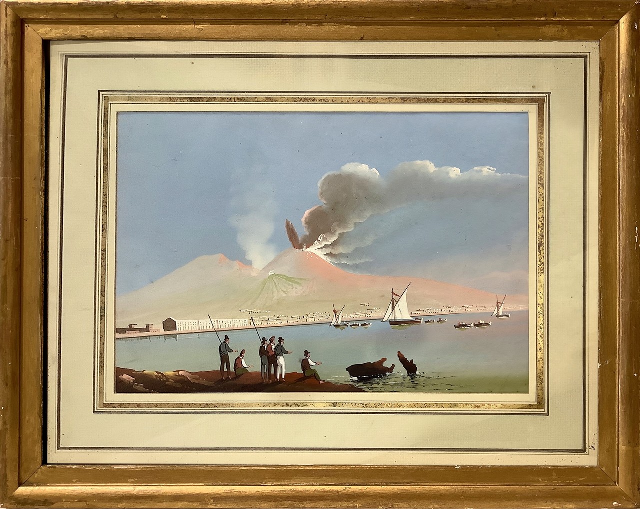 Dipinto raffigurante barche e personaggi con vulcano sullo sfondo, Fine 19° Secolo cm. 23 x 15.5 in cornice 32 x 38. Gouache su tavola