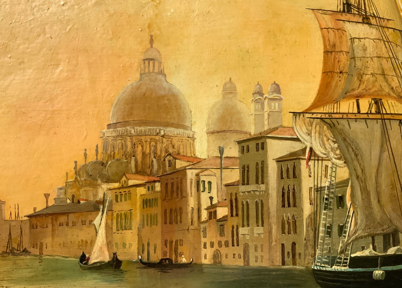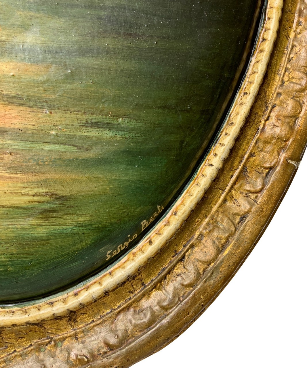 Sergio Berti - Canale di Venezia 77x58 cm Olio su tela gessata ovale Dipinto ovale firmato inbasso a destra Sergio Berti