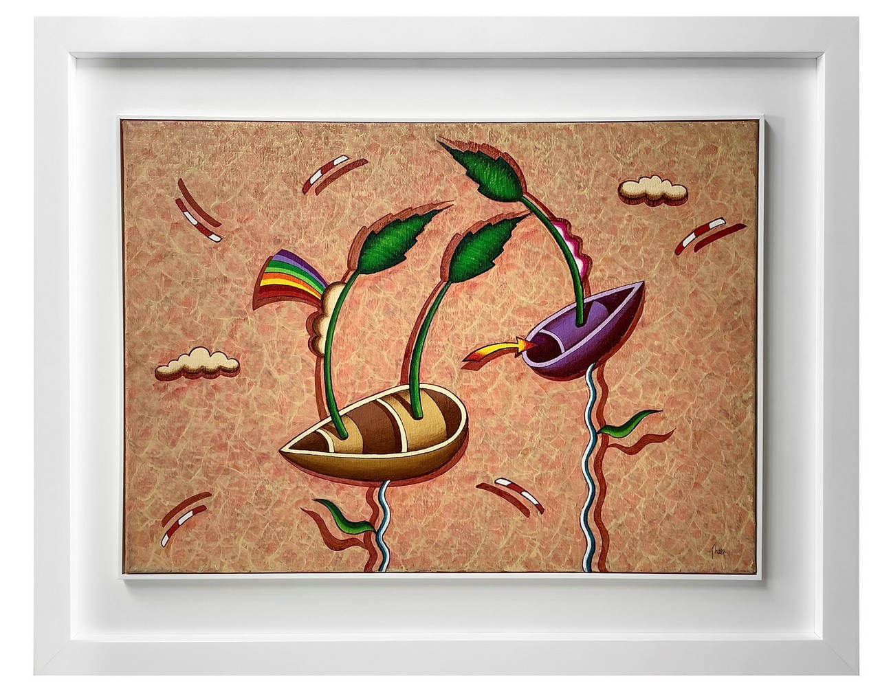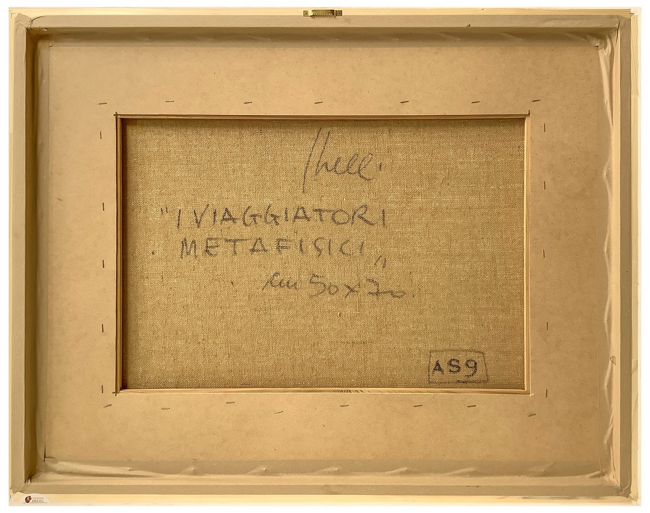 Giuliano Ghelli - I viaggiatori metafisici Cm 50x70, in cornice cm 74x94 Dipinto ad olio su tela Firmato in basso a destra, firmato e titolato al retro