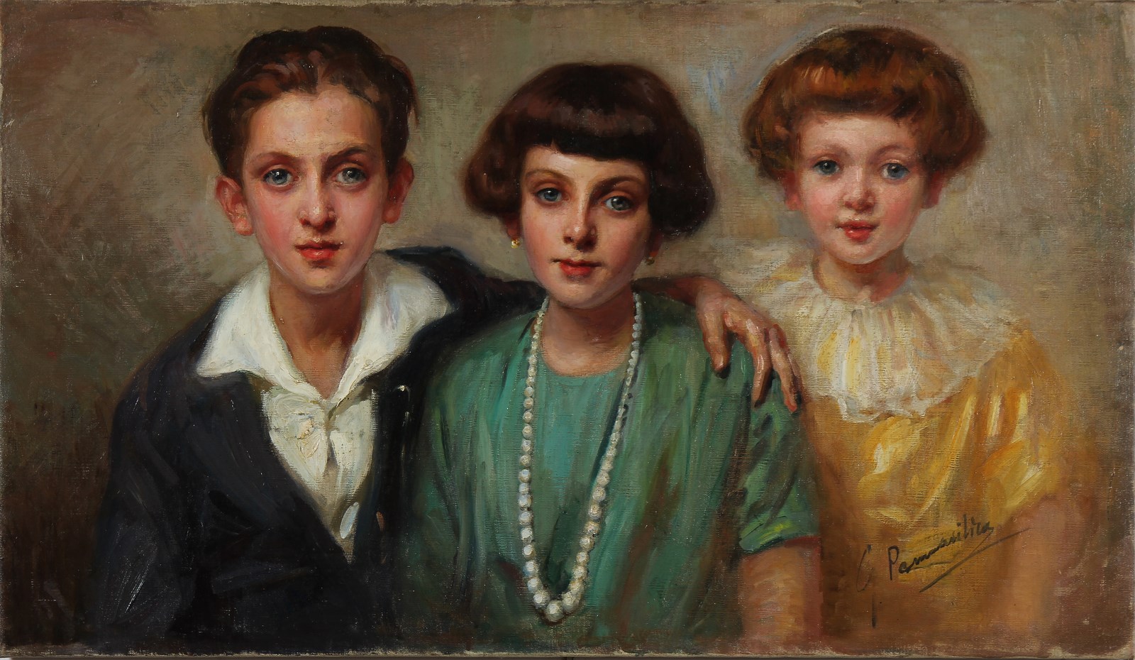 PENNASILICO GIUSEPPE (1861 - 1940) Tre fanciulli. Olio su tela . Cm 90,00 x 52,00 x 2,00. Firma in basso a destra.