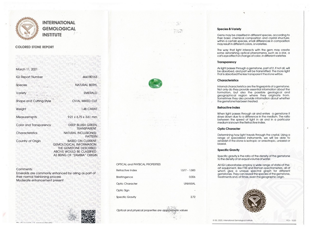 Smeraldo certificato IGI, Provenienza Zambia. Colore F,Purezza V/S