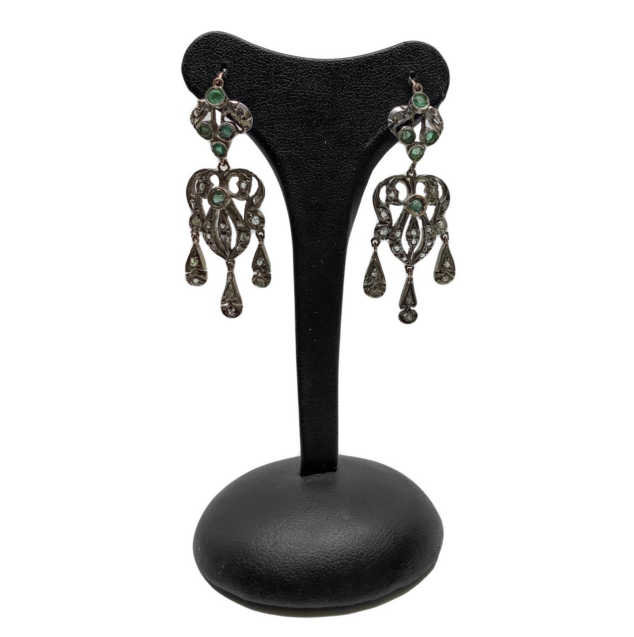 Orecchini Liberty in oro e argento con rosette di brillanti e smeraldo 13.5 gr.