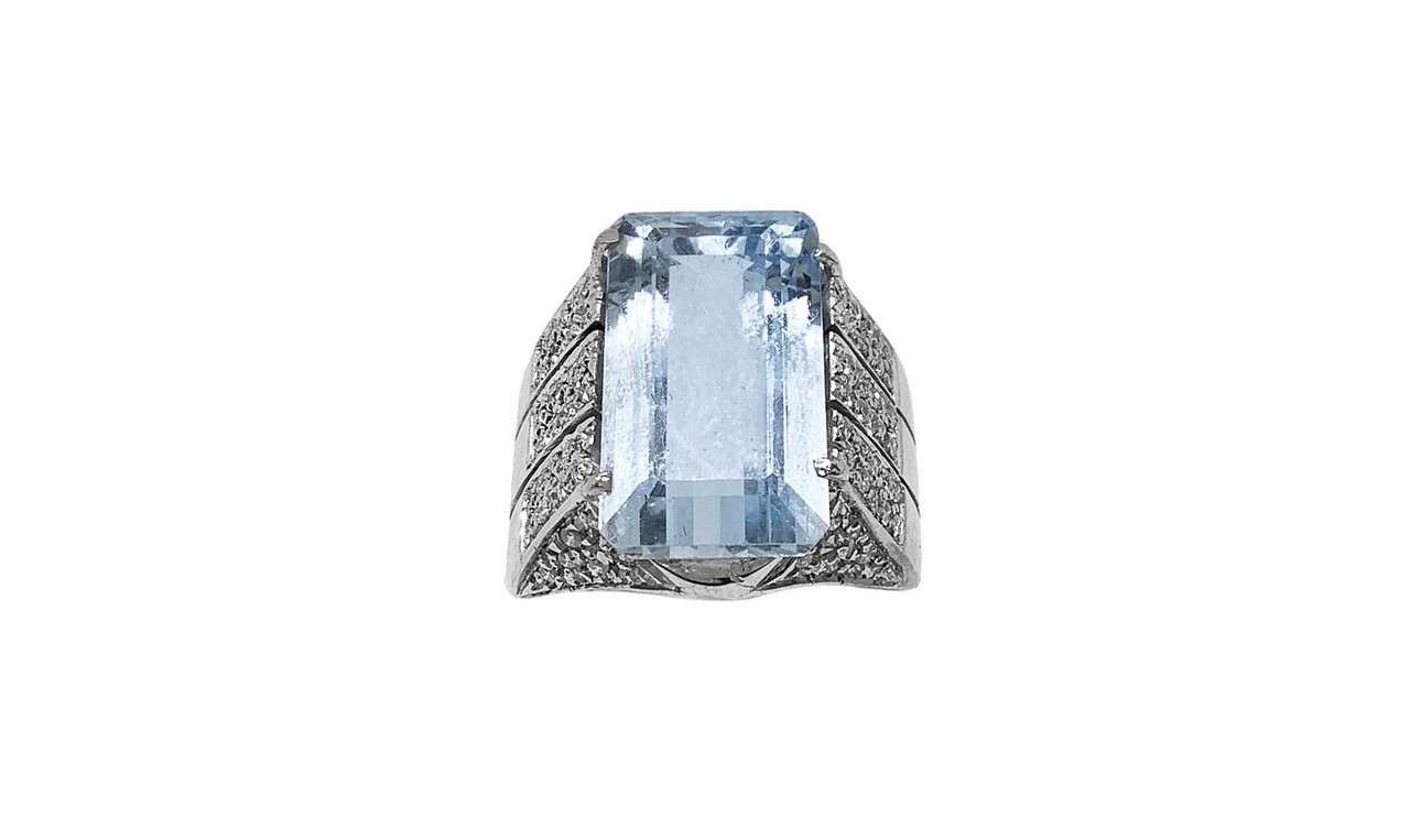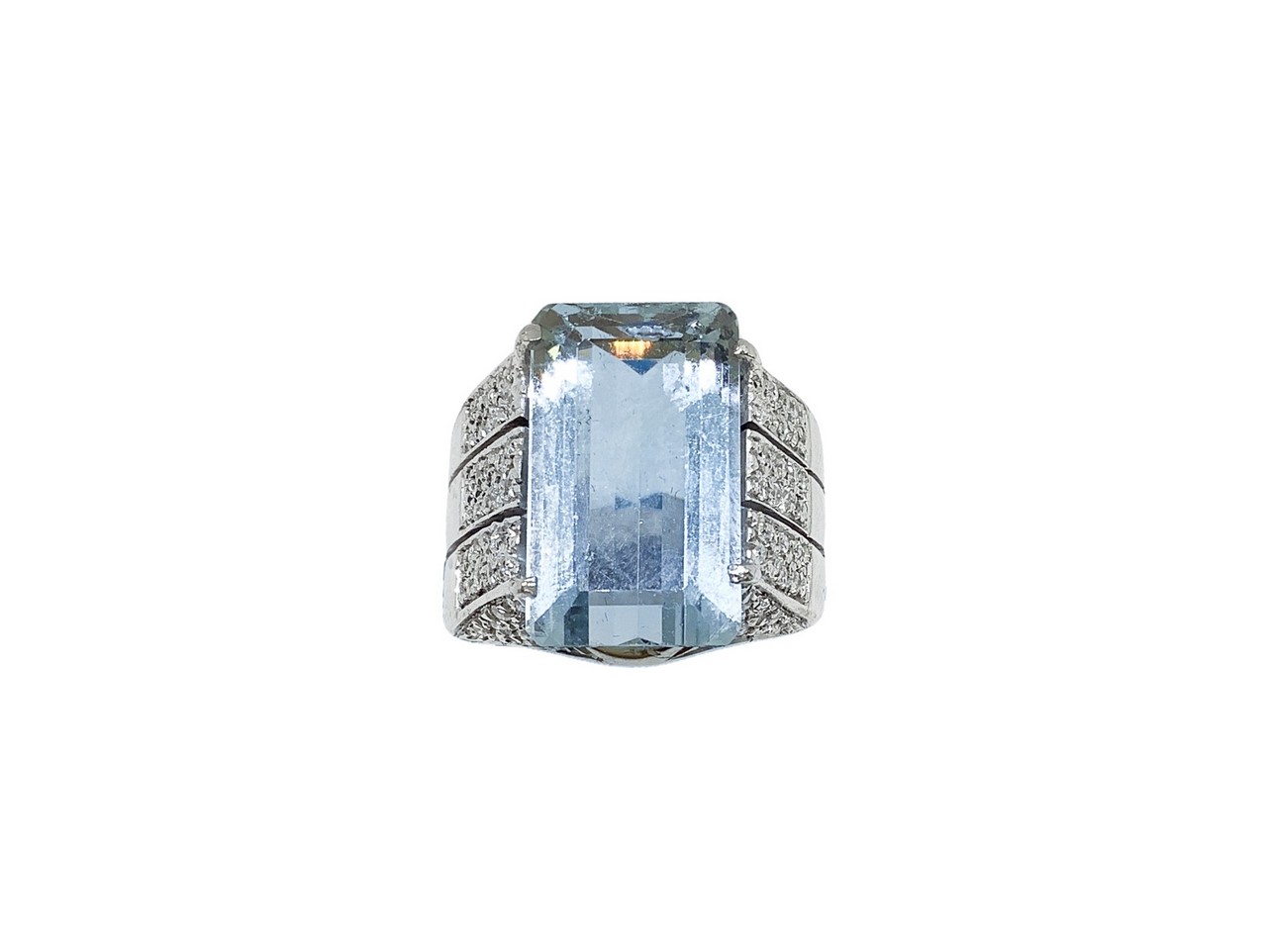 Anello in oro bianco 750 con acquamarina 10 Kt e diamanti taglio brillanti 1,20 Kt 12,06 gr Colore G; Purezza W/S