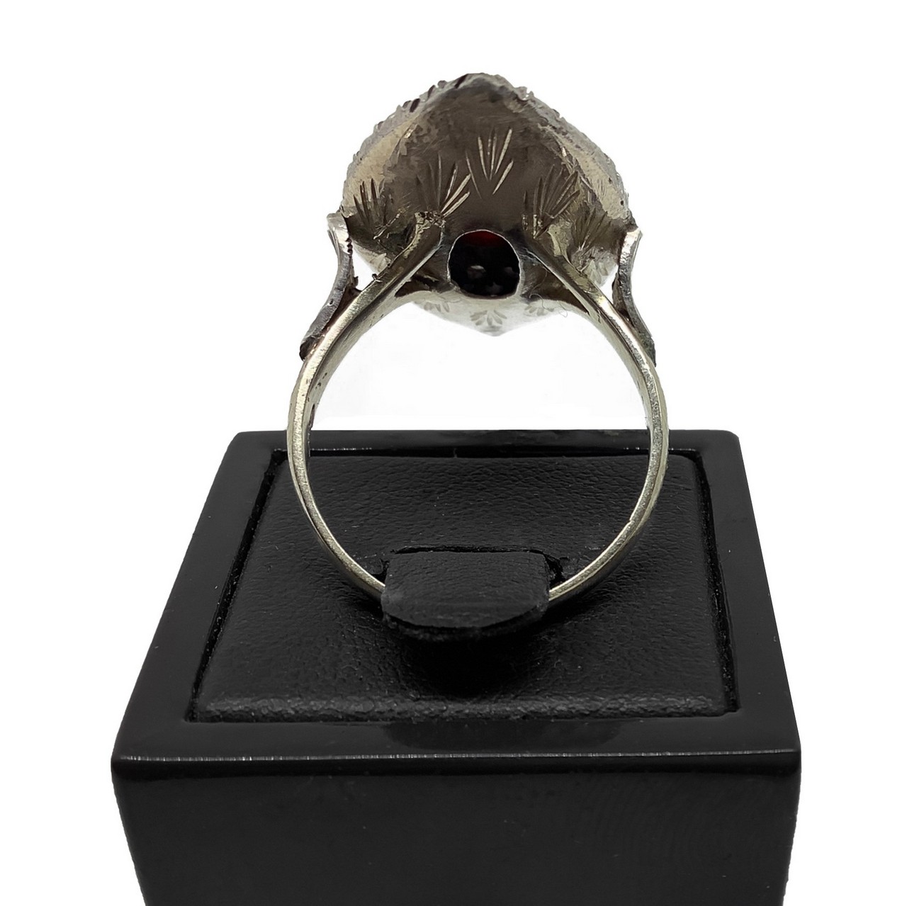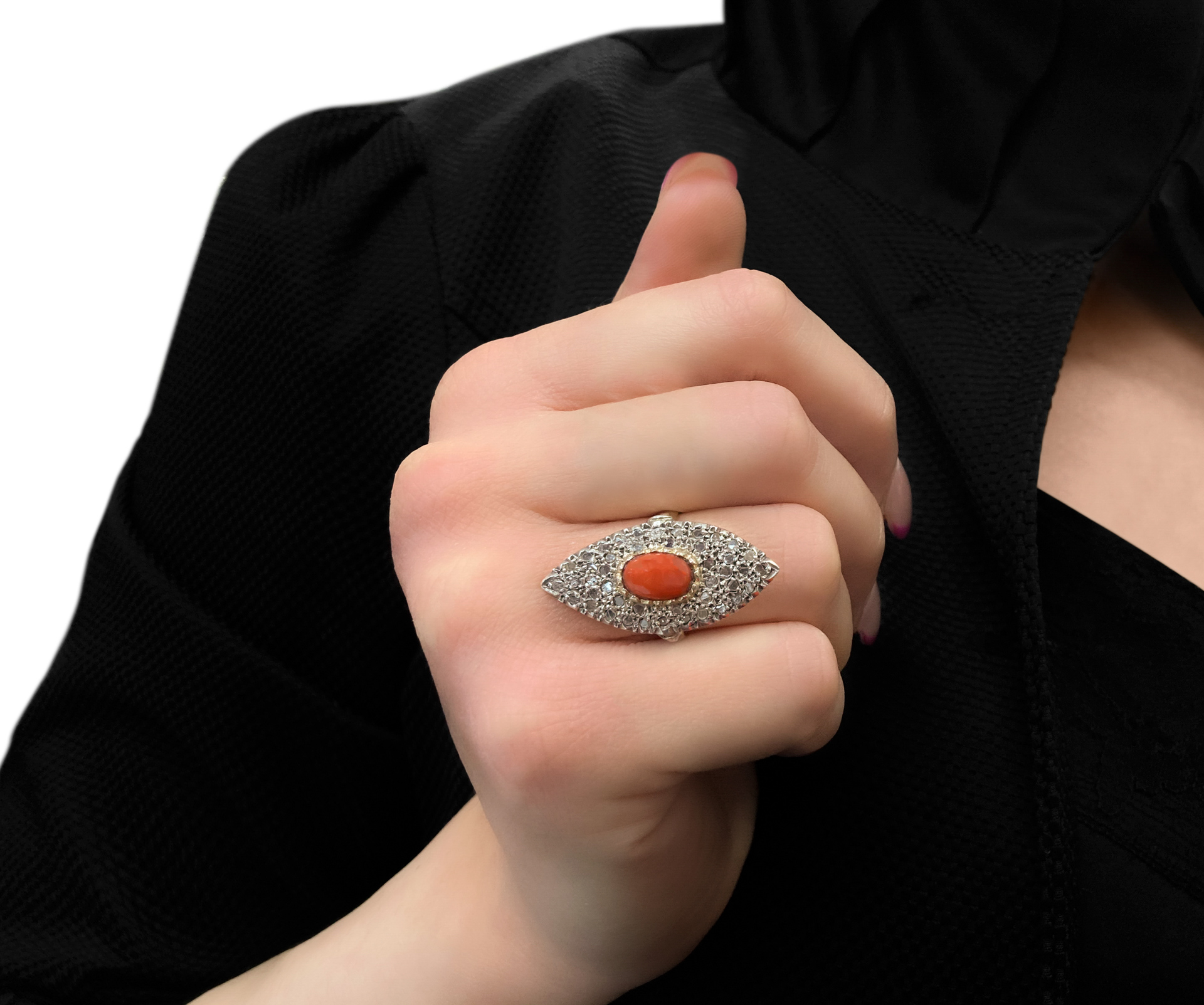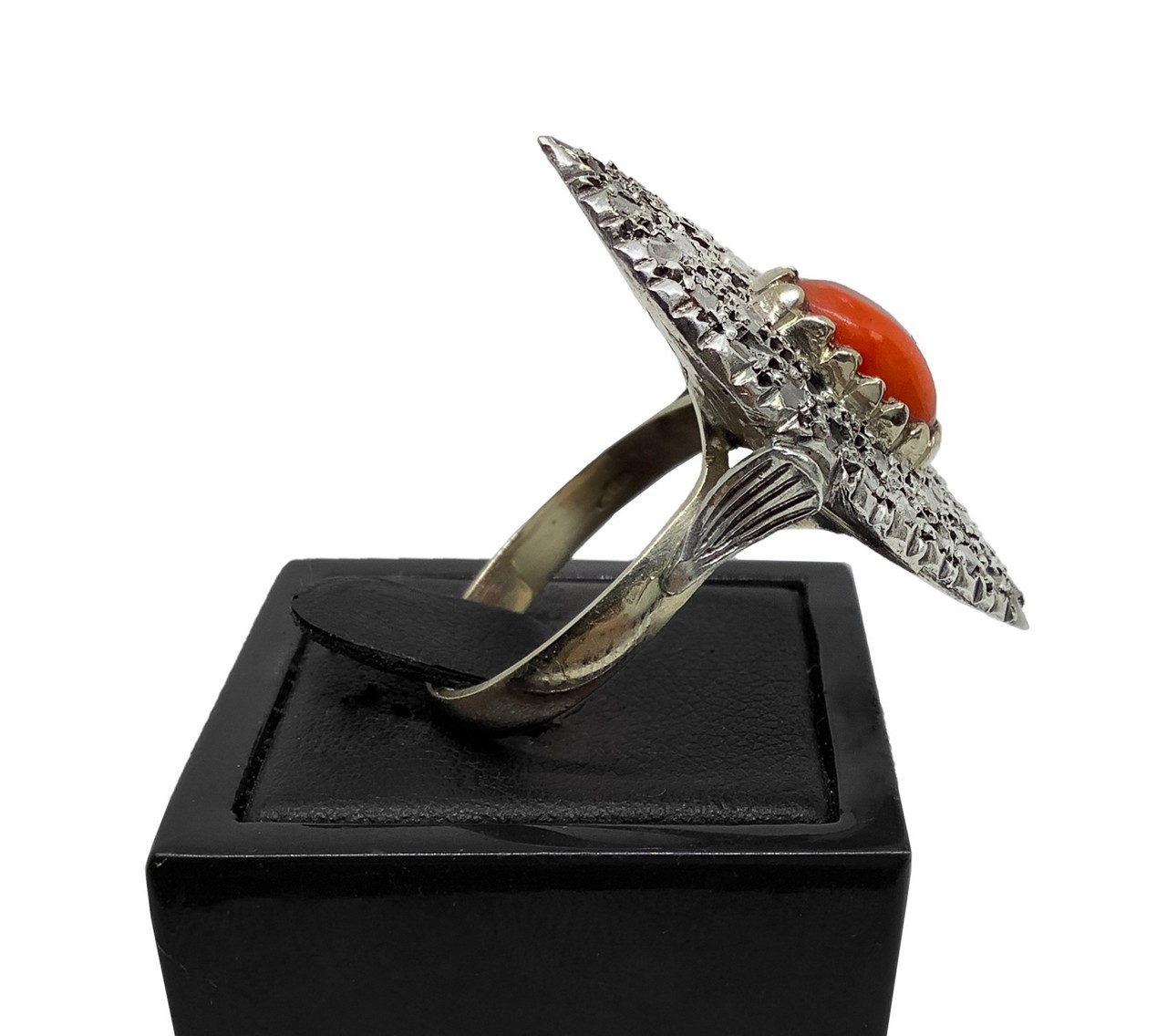 Anello spoletta in oro basso titolo 9 carati, diamanti e corallo misura 18, 7,4 gr.