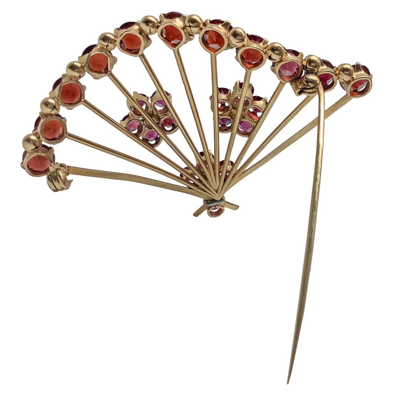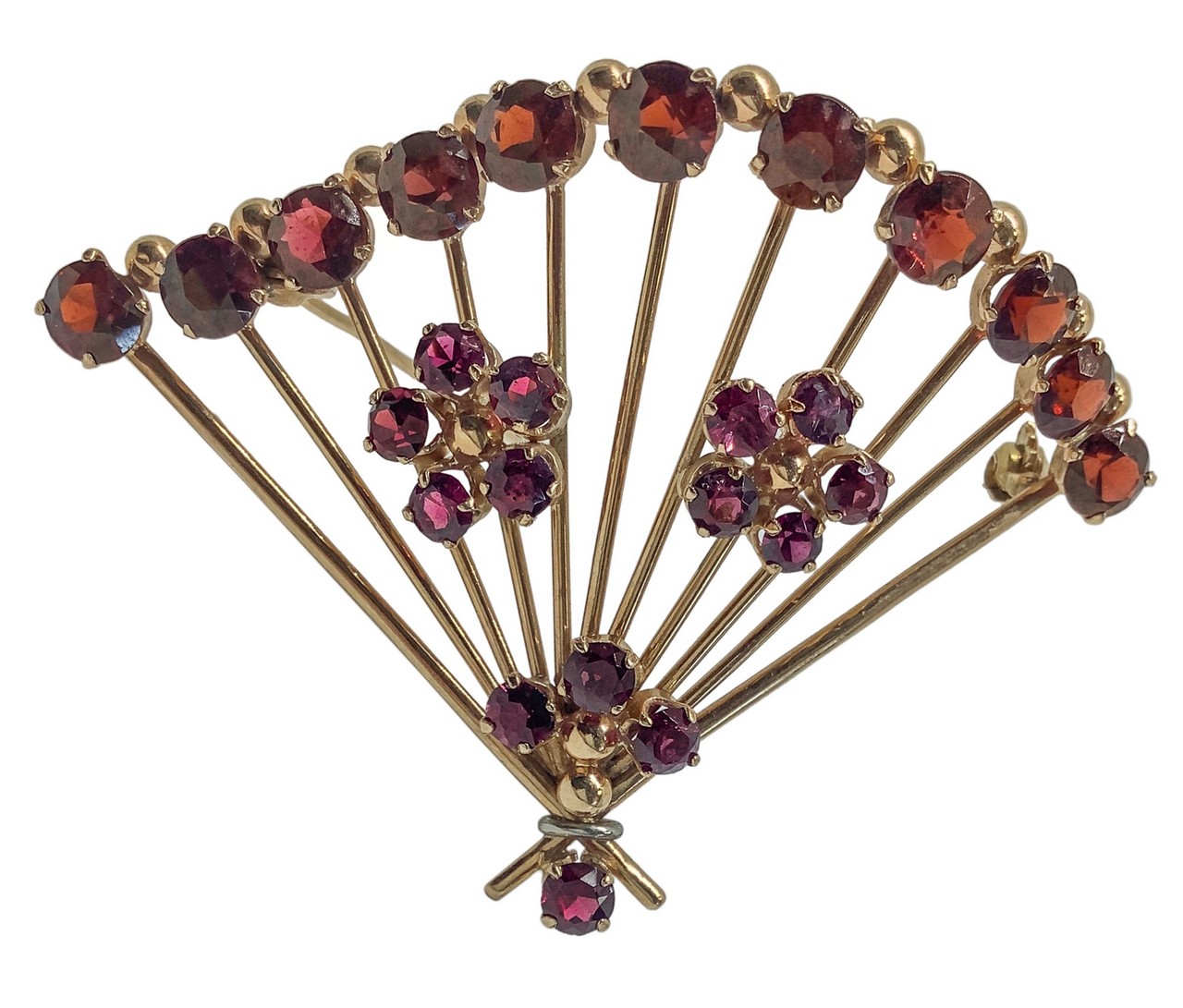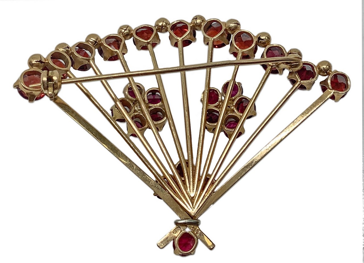 Spilla a ventaglio in oro 18 carati con granati, 1950s gr. 14,7, 7x5 cm