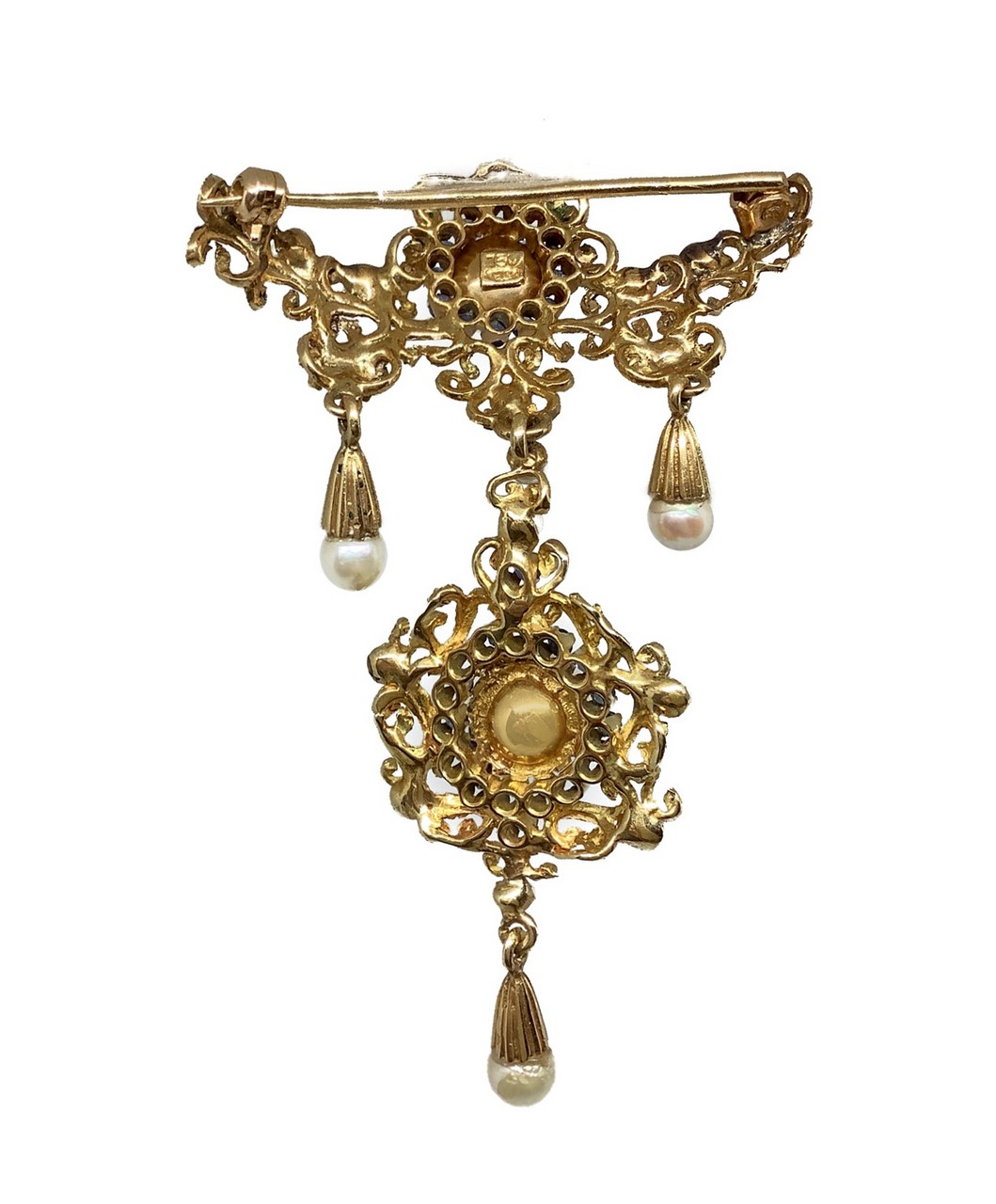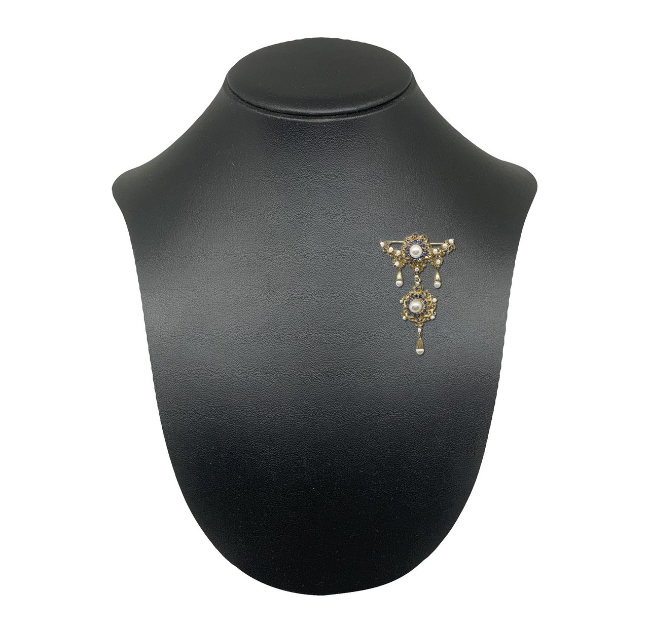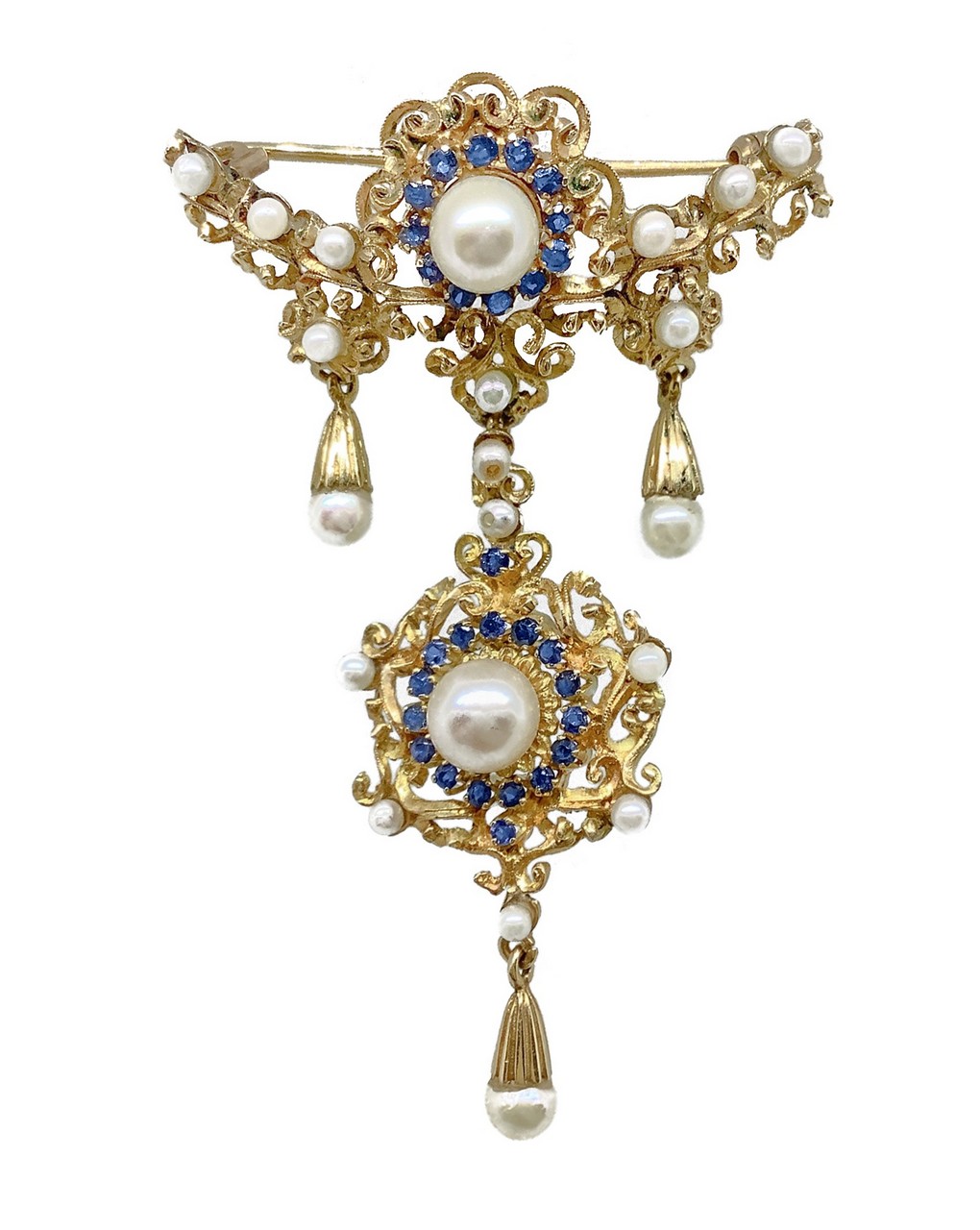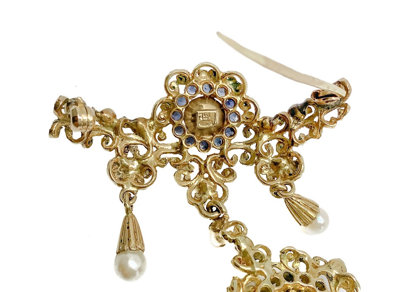 Spilla in oro giallo 18 Kt con perle bianche coltivate naturali akoija di forma sferica e centrali contornati da zaffiri blu naturali, 1950s / 70s 13,5 gr Lavorazione minuziosa fatta a mano, Produzione Italiana. Marchio 750