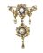 Spilla in oro giallo 18 Kt con perle bianche coltivate naturali akoija di forma sferica e centrali contornati da zaffiri blu naturali, 1950s / 70s