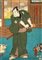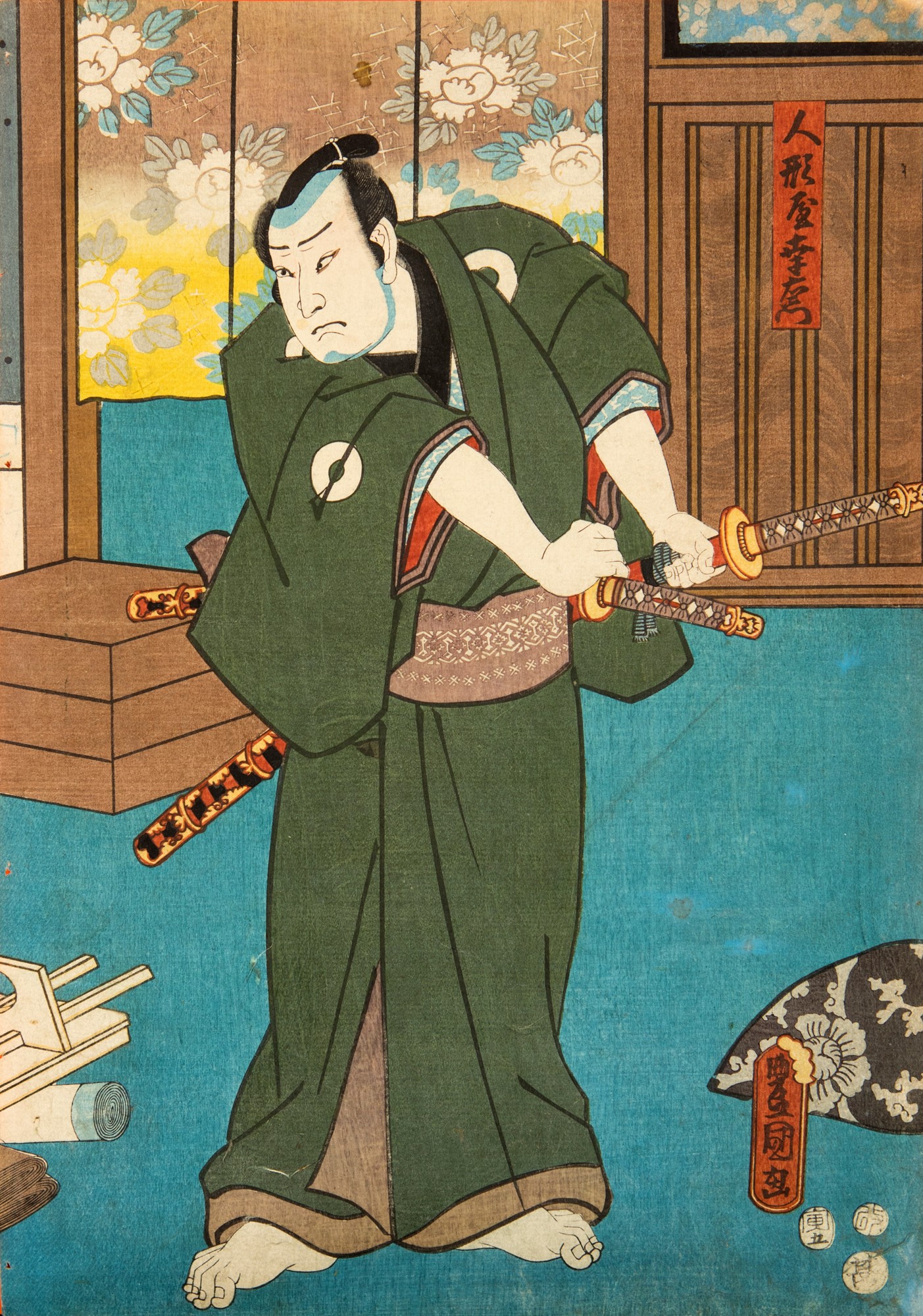 Antica xilografia policroma su carta, Giappone, seconda metà del XIX secolo raffigurante una scena dal teatro Kabuki con guerriero, cm 34x24