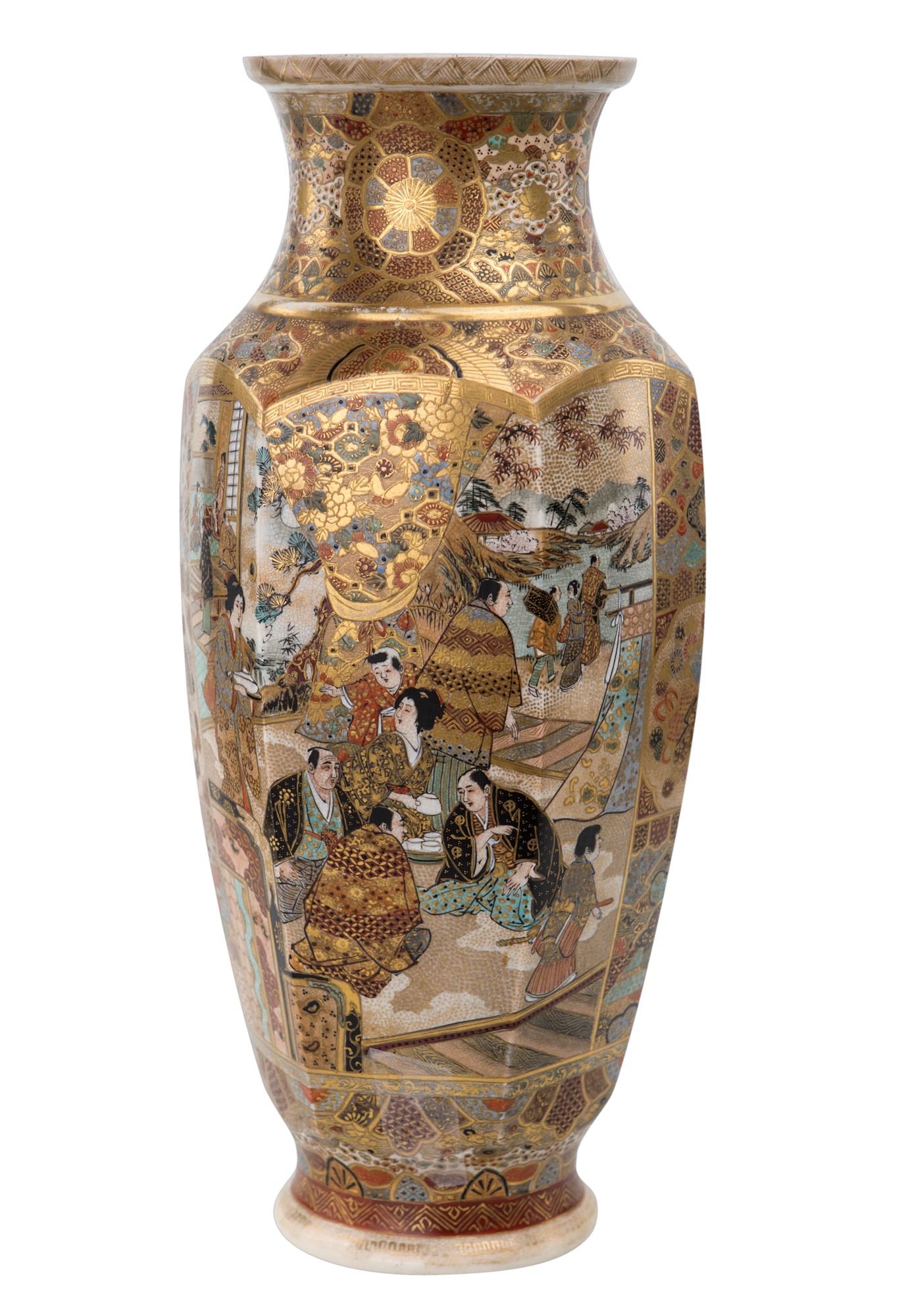 Vaso Satsuma "mille facce" in ceramica, Giappone, periodo Meiji a pianta esagonale interamente decorato in policromia su fondo dorato nei modi e colori caratteristici della manifattura di Satsuma; completo di supporto con portalampada, altezza cm 45