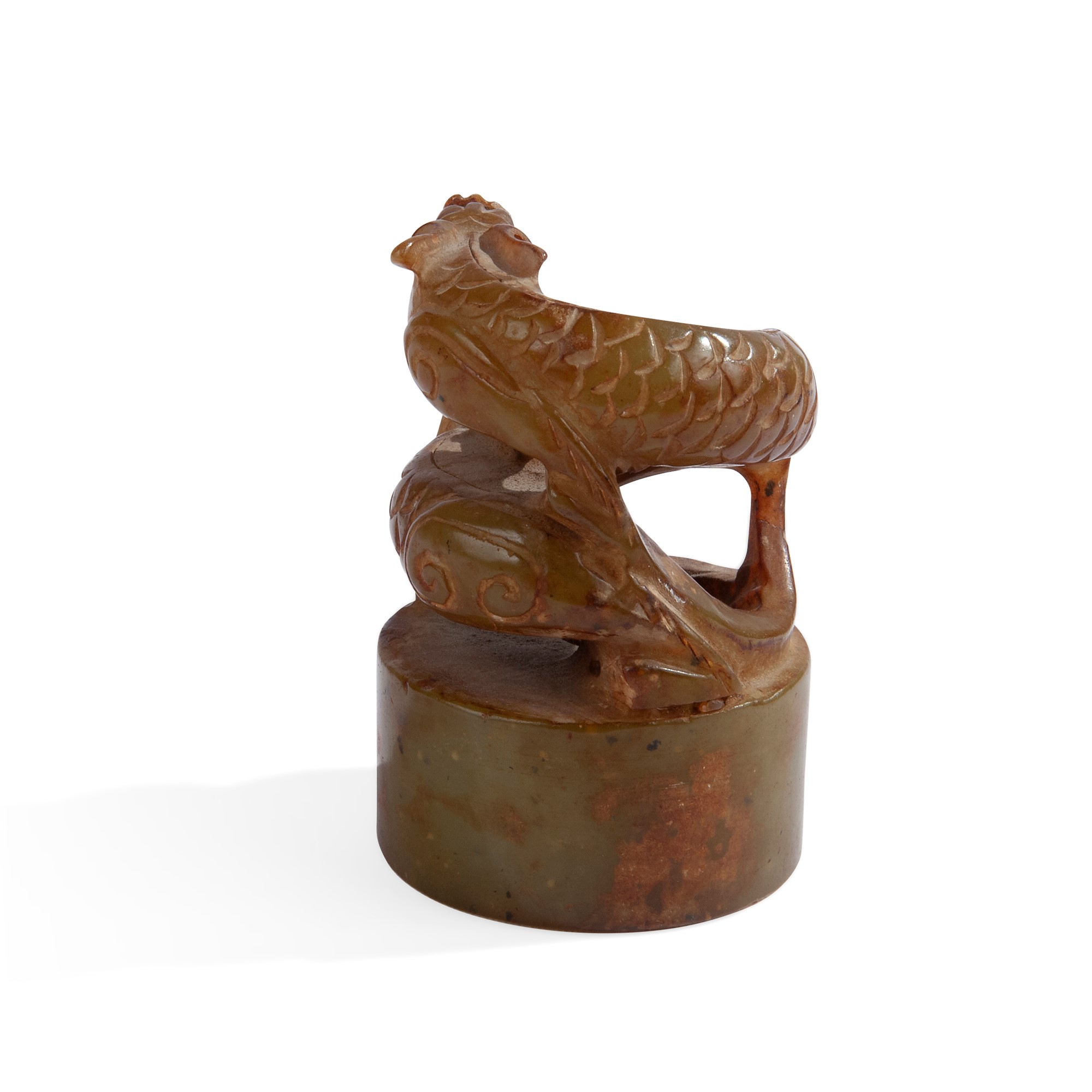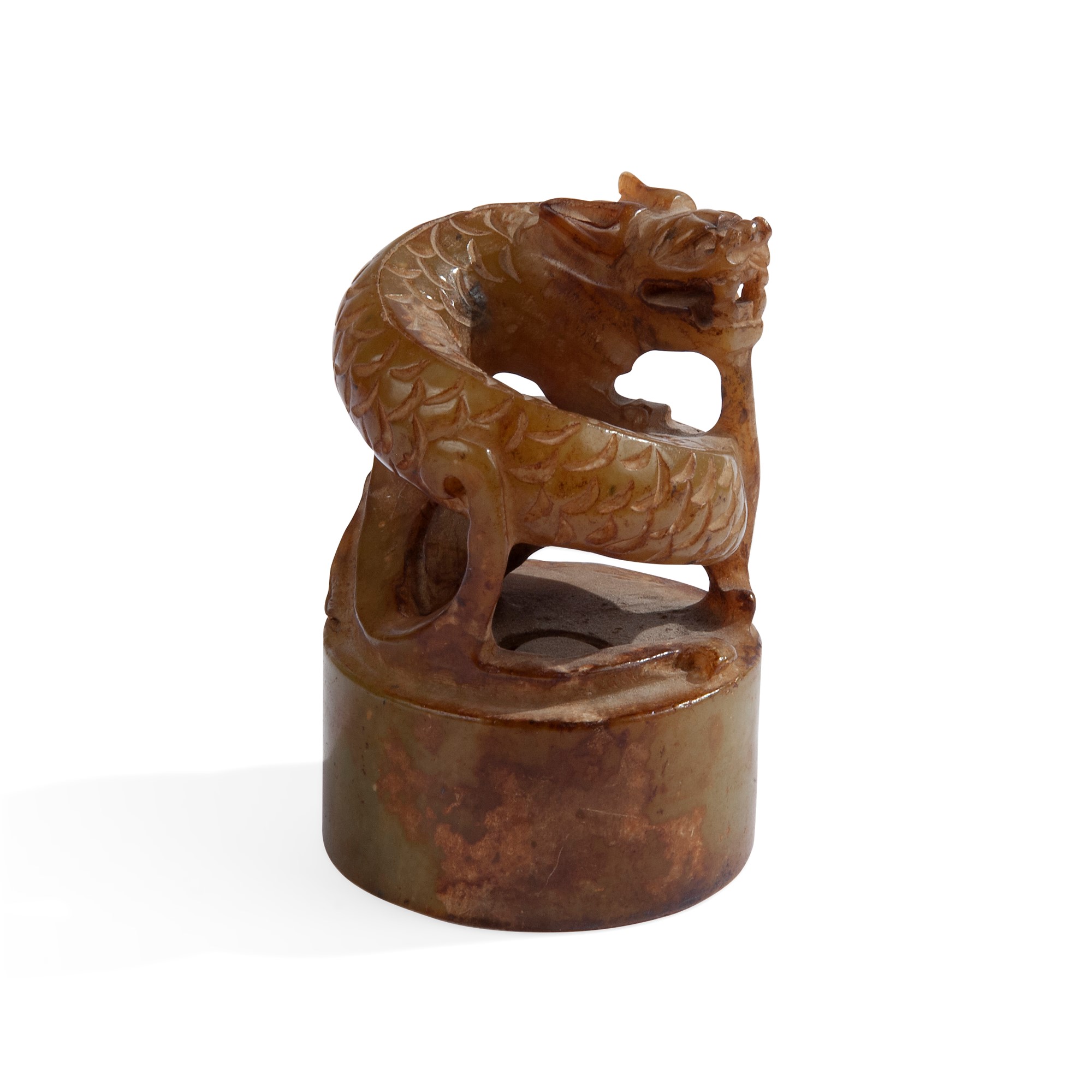 Sigillo in nefrite, Cina, XX secolo di forma circolare sormontato da un drago intagliato, cm 8x5,5
