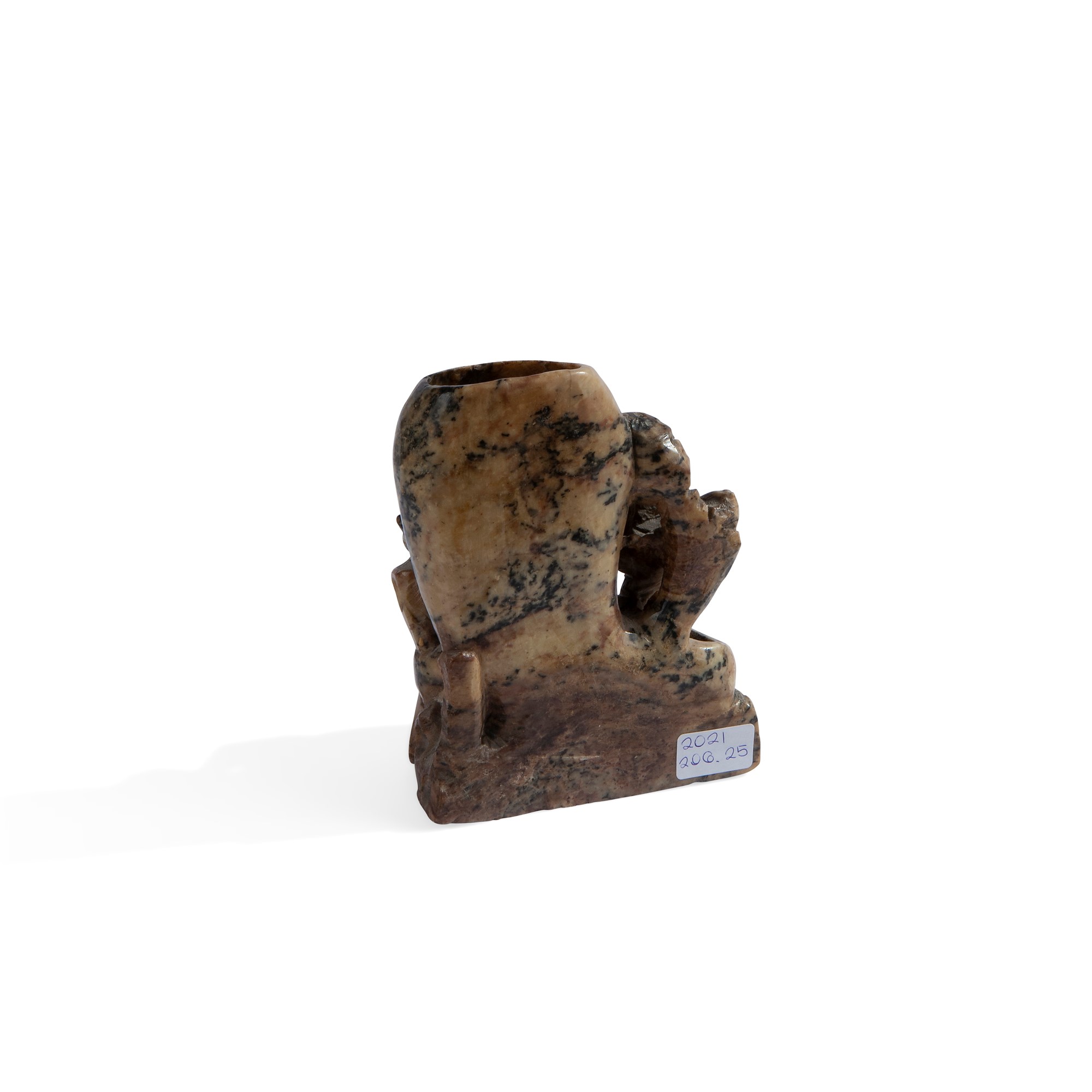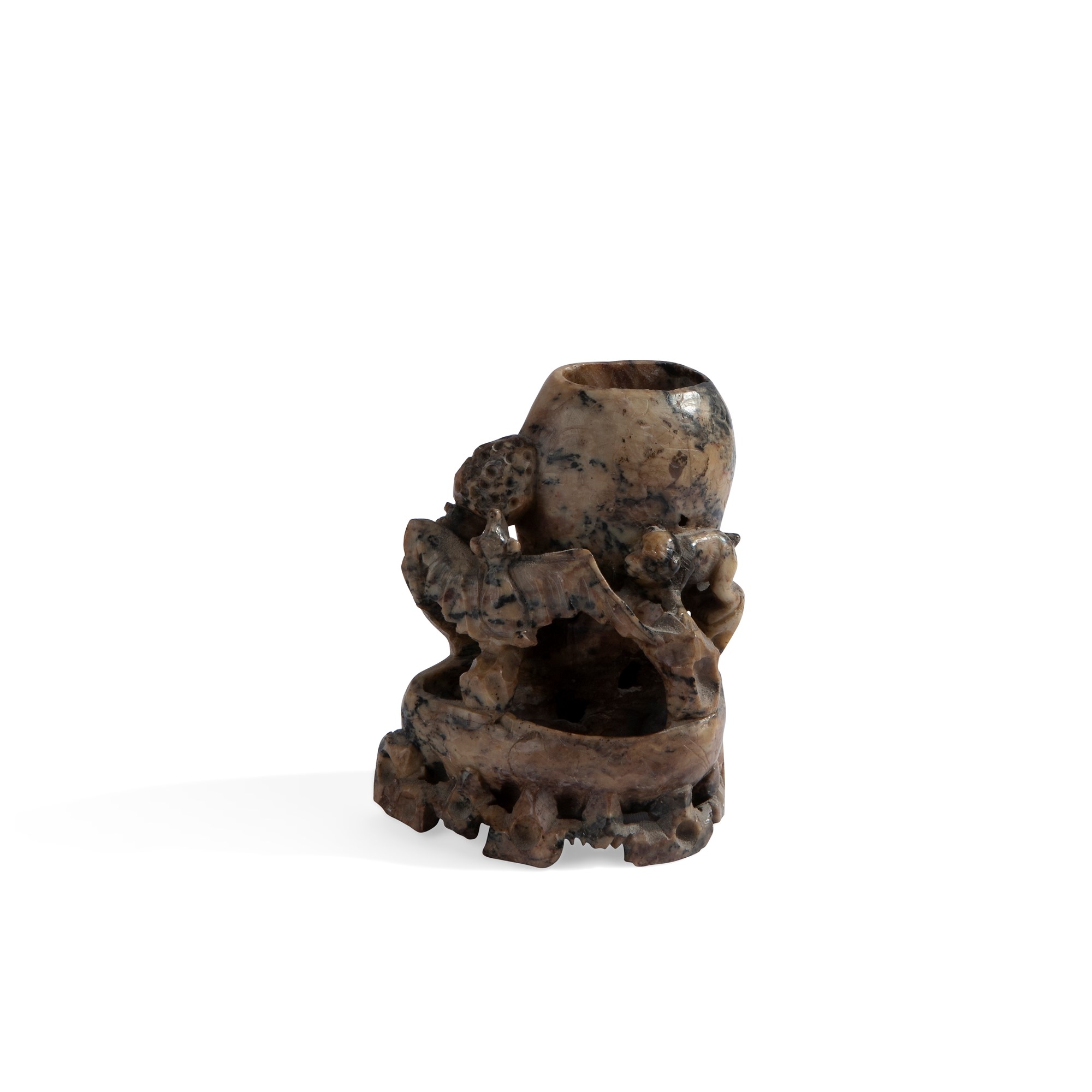 Composizione in pietra gialla e nera con doppia vaschetta, Cina, XX secolo con figure di scimmia e pipistrello intagliate, cm 13,5x11x8