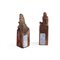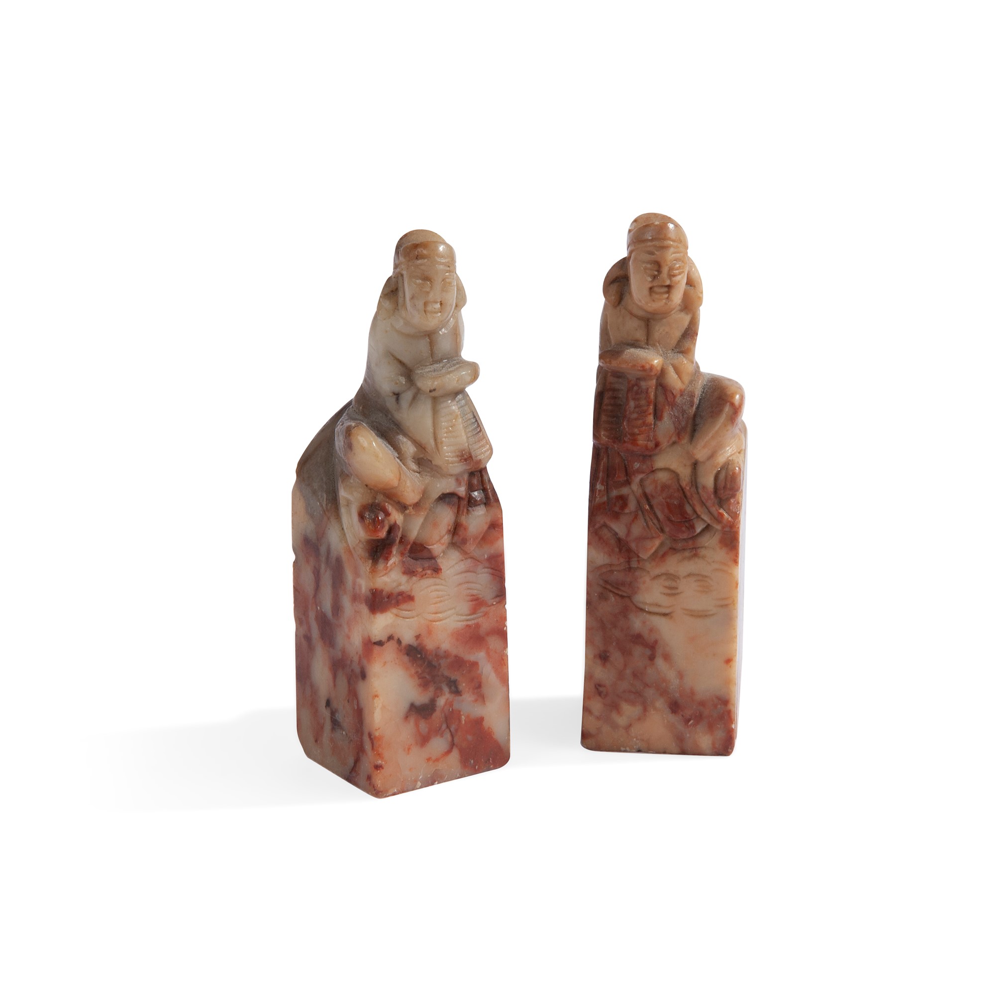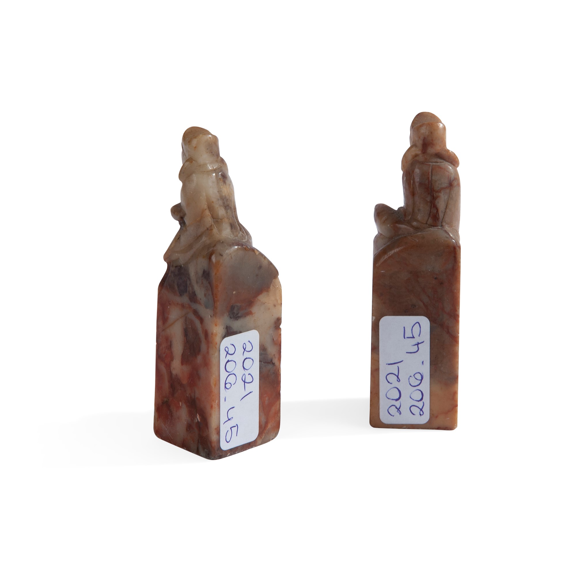 Coppia di piccoli sigilli in pietra dura gialla/rossa, Cina, XX secolo sormontati da figure e privi di iscrizione, cm 7,5x2x2