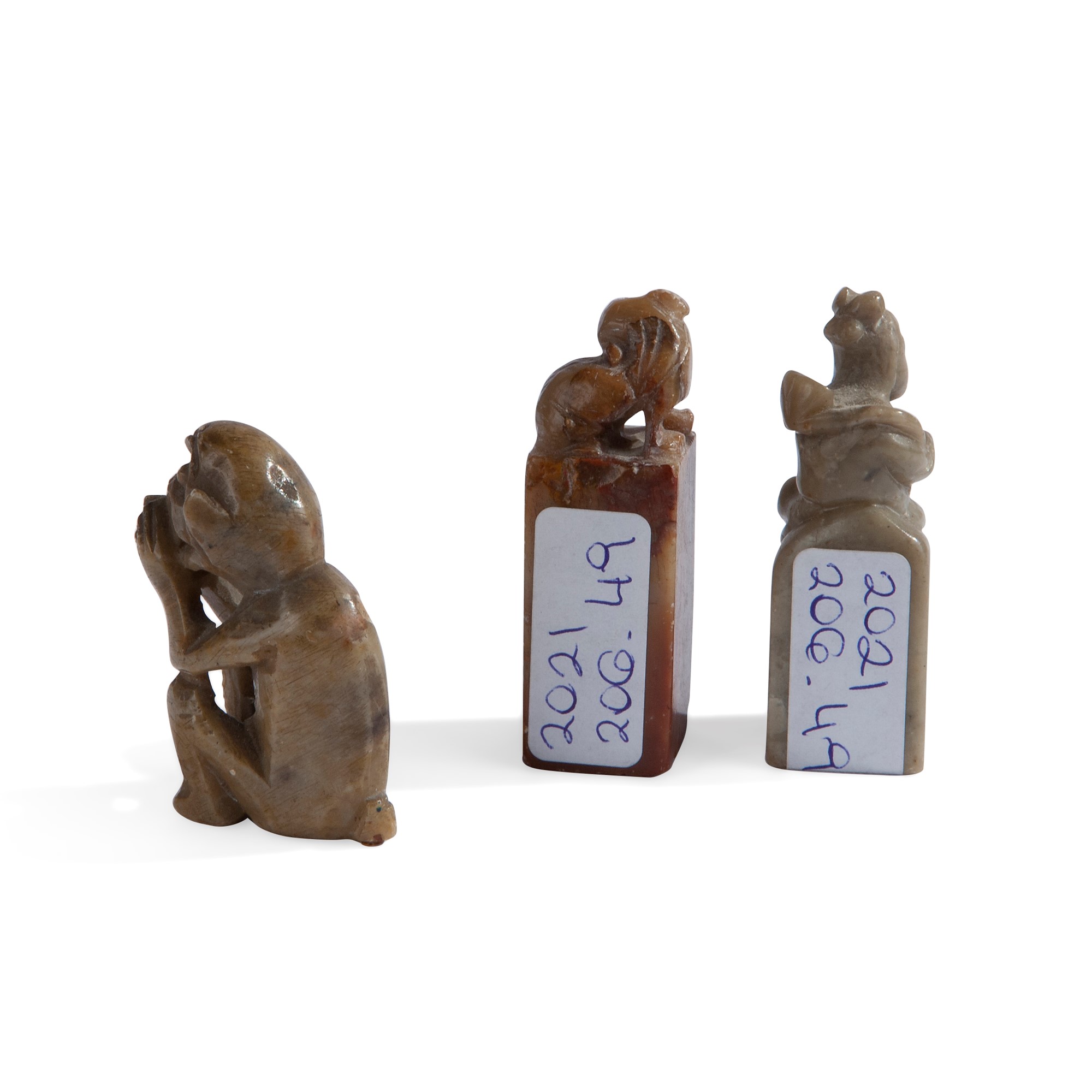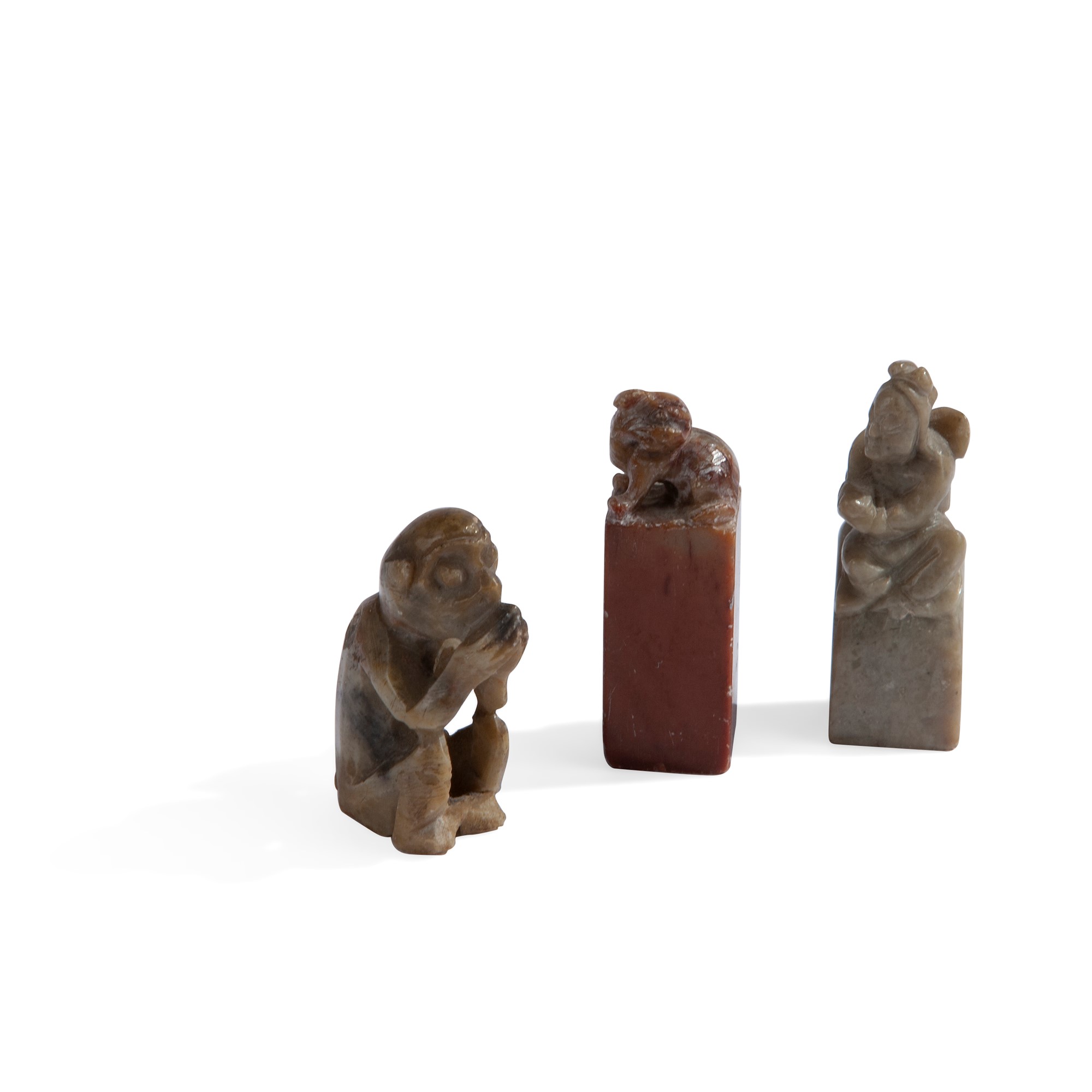 Lotto composto da un intaglio e due sigilli diversi, Cina, XX secolo una figura di scimmia seduta, un piccolo sigillo in pietra rossa con cane di Pho e iscrizione sotto la base; un piccolo sigillo in giada con figura (privo di iscrizione), misure diverse