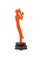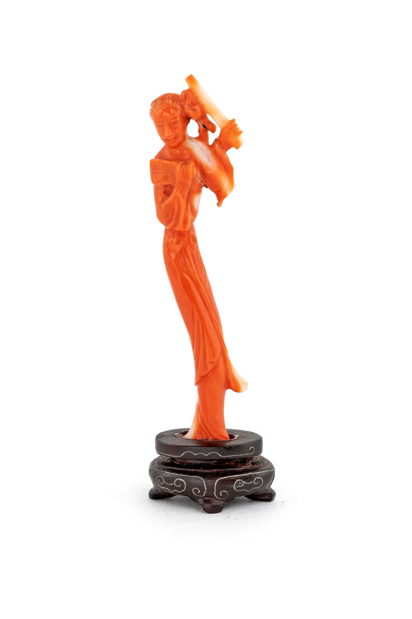 Intaglio su corallo cerasuolo, XX secolo raffigurante una geisha; basetta in legno con inserto filiforme in argento, altezza cm 8 (con la base cm 9,5) - gr. 10.