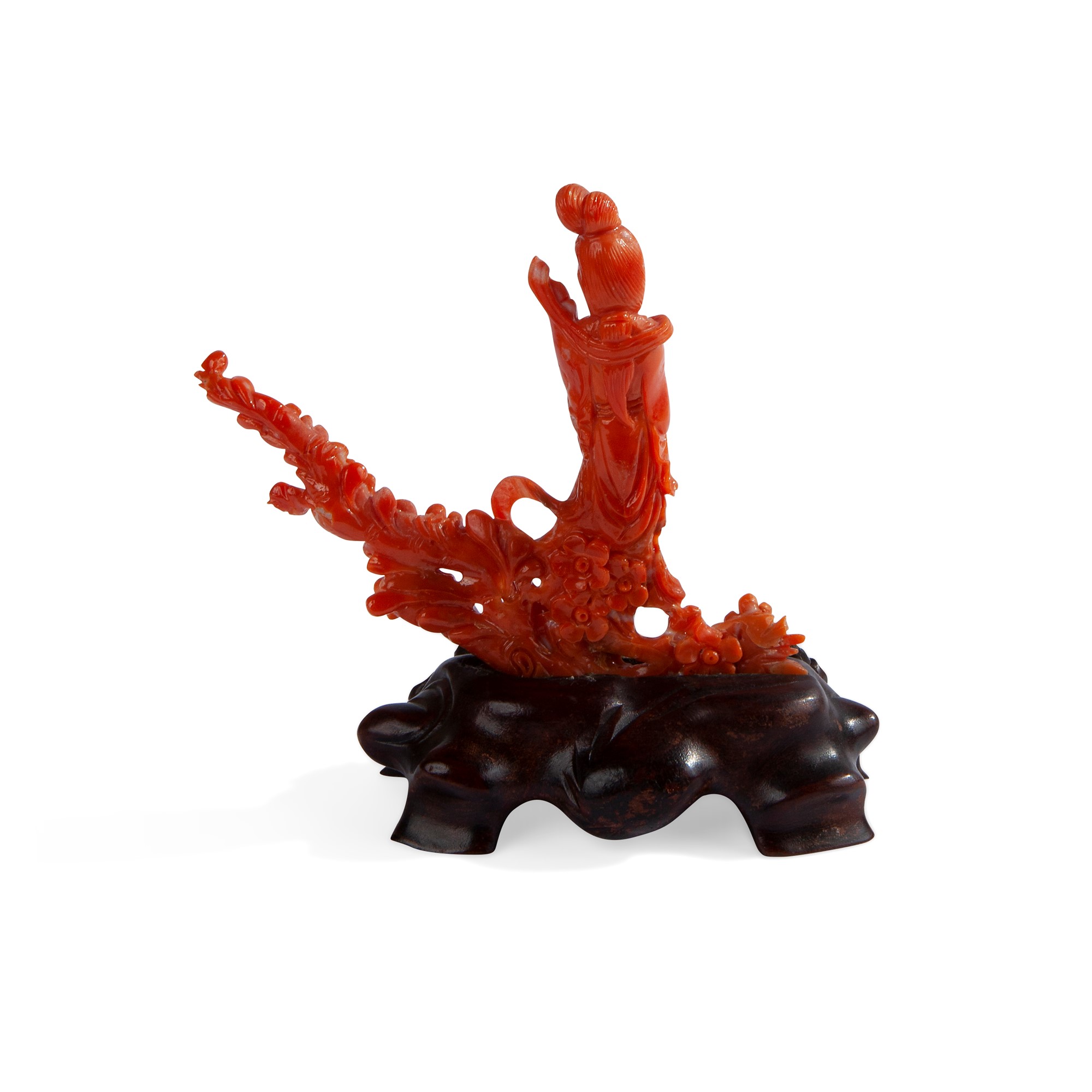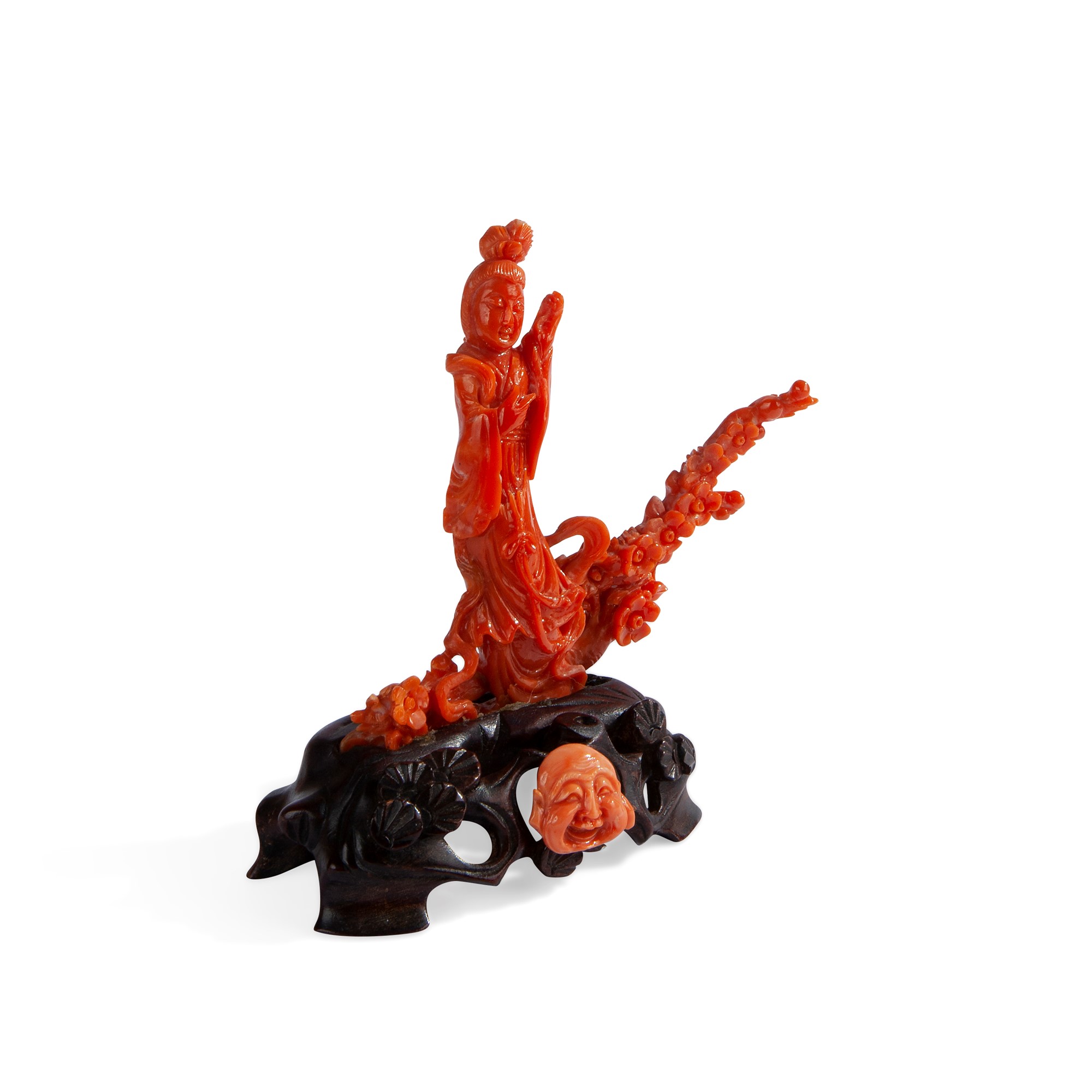 Ramo di corallo rosso asiatico intagliato, XX secolo raffigurante una geisha tra fiori; supporto in legno impreziosito da volto di Buddha in corallo, cm 12x13x5,5.