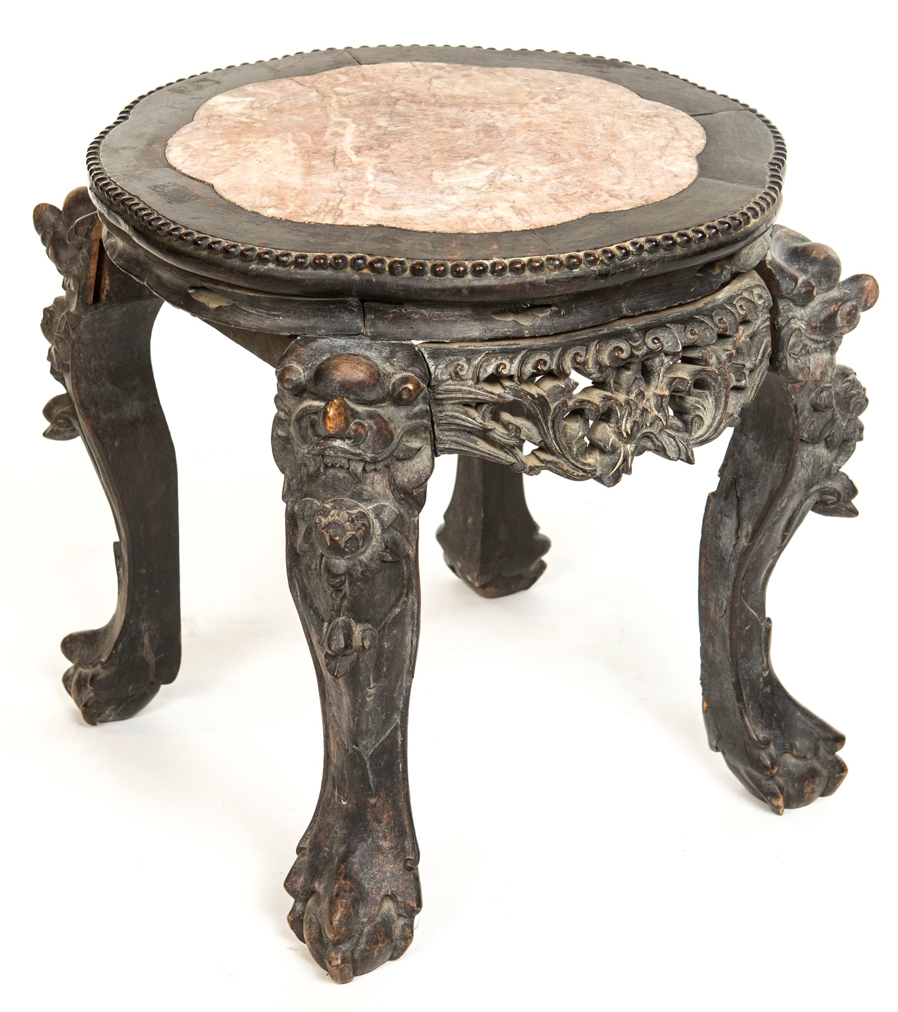 Base in tek intagliato, Cina, XIX/XX secolo con piano circolare lobato percorso da perlinatura e specchio incassato in marmo; gambe zoomorfe, cm 45x55