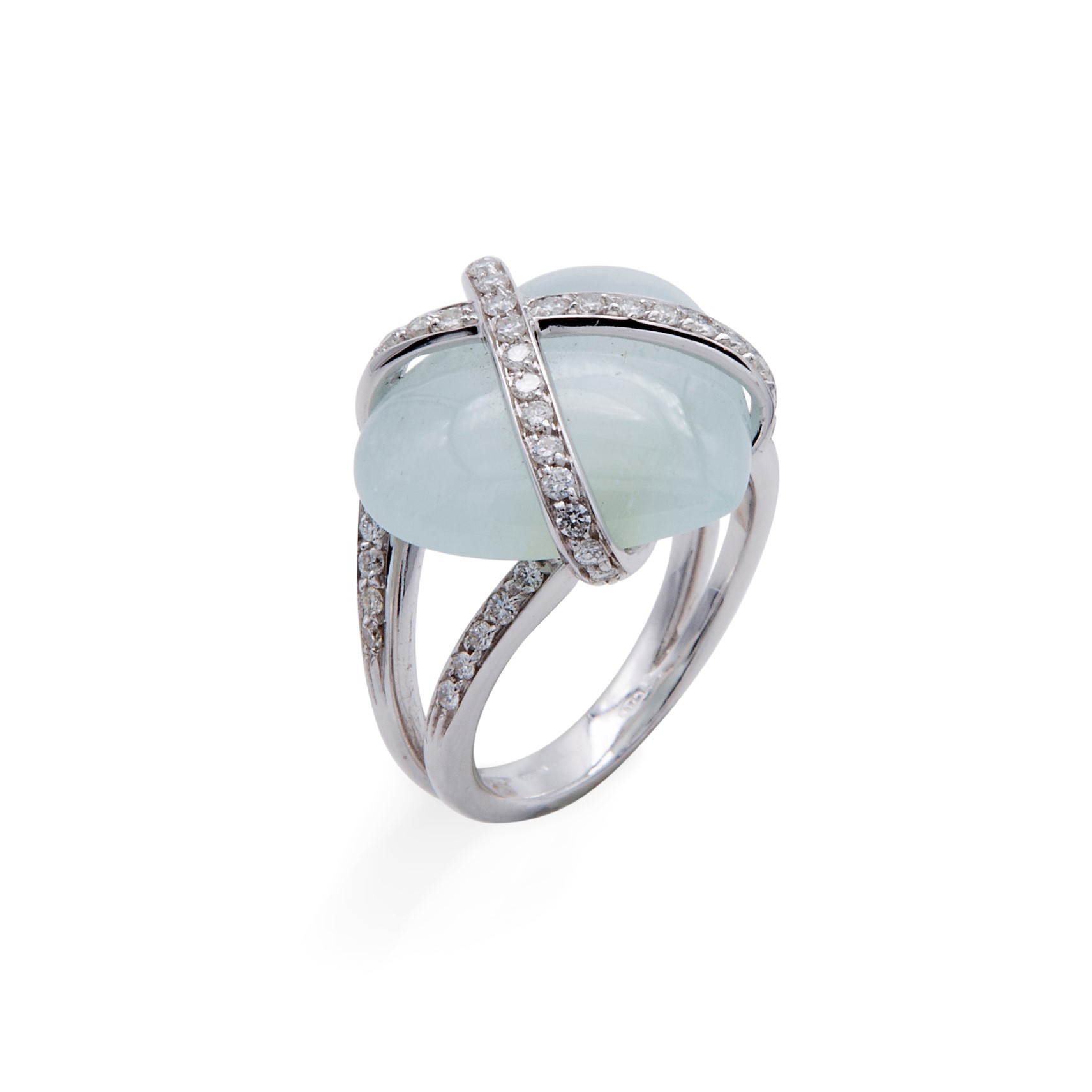 Oro 750/000, acquamarina Milk in taglio cuore e brillanti. Peso complessivo gr 8,5.