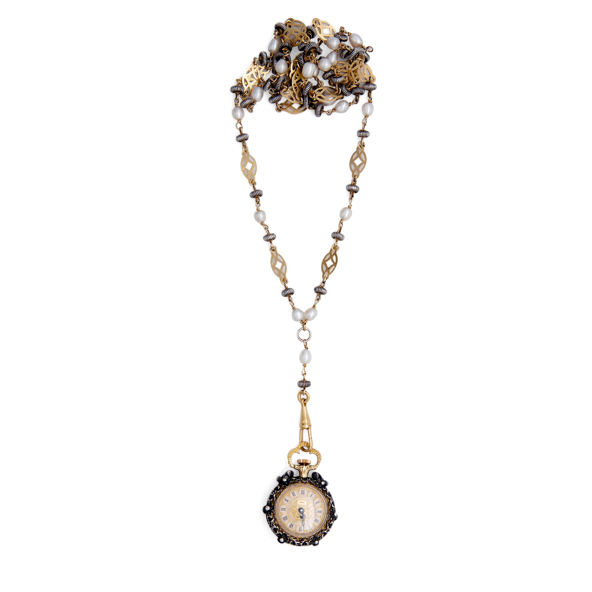 Collana in oro e argento con orologio pendente, diamanti e rubini.