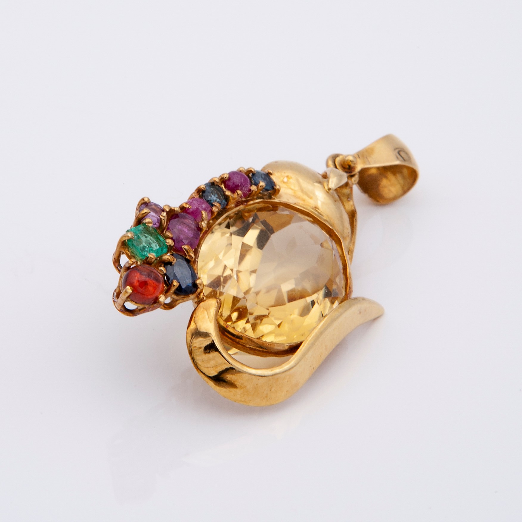Pendente in oro con quarzo citrino centrale, smeraldi, rubini e zaffiri