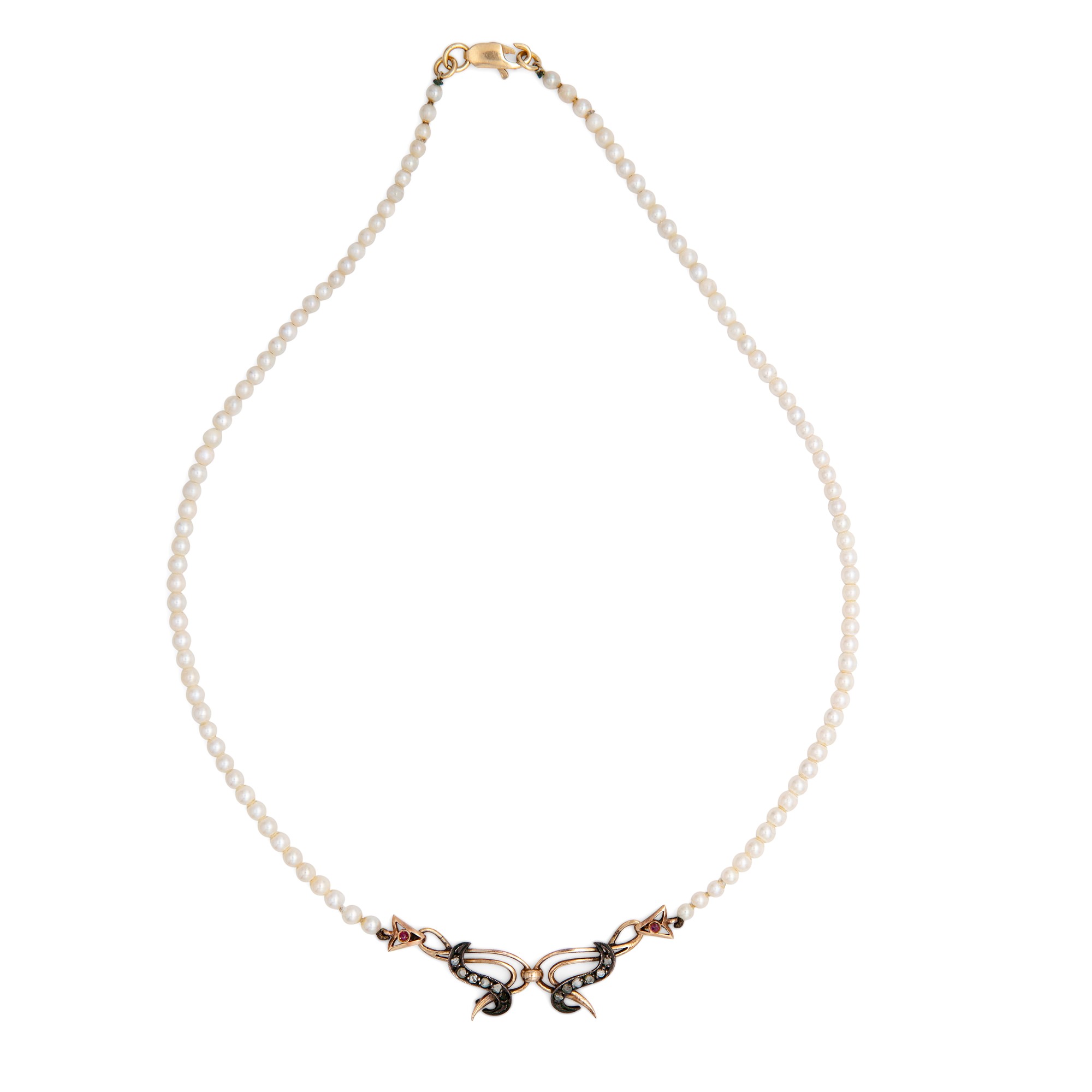 Oro 585/000, argento, diamanti in taglio rosa, perle freshwater.