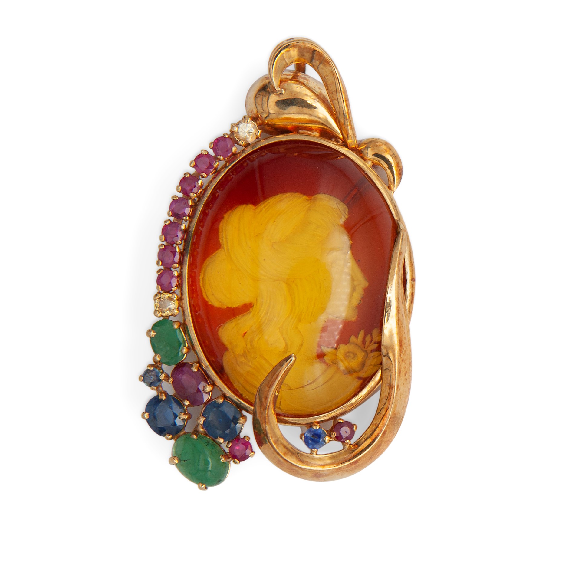 Pendente con cammeo su ambra più zaffiri, rubini e smeraldi