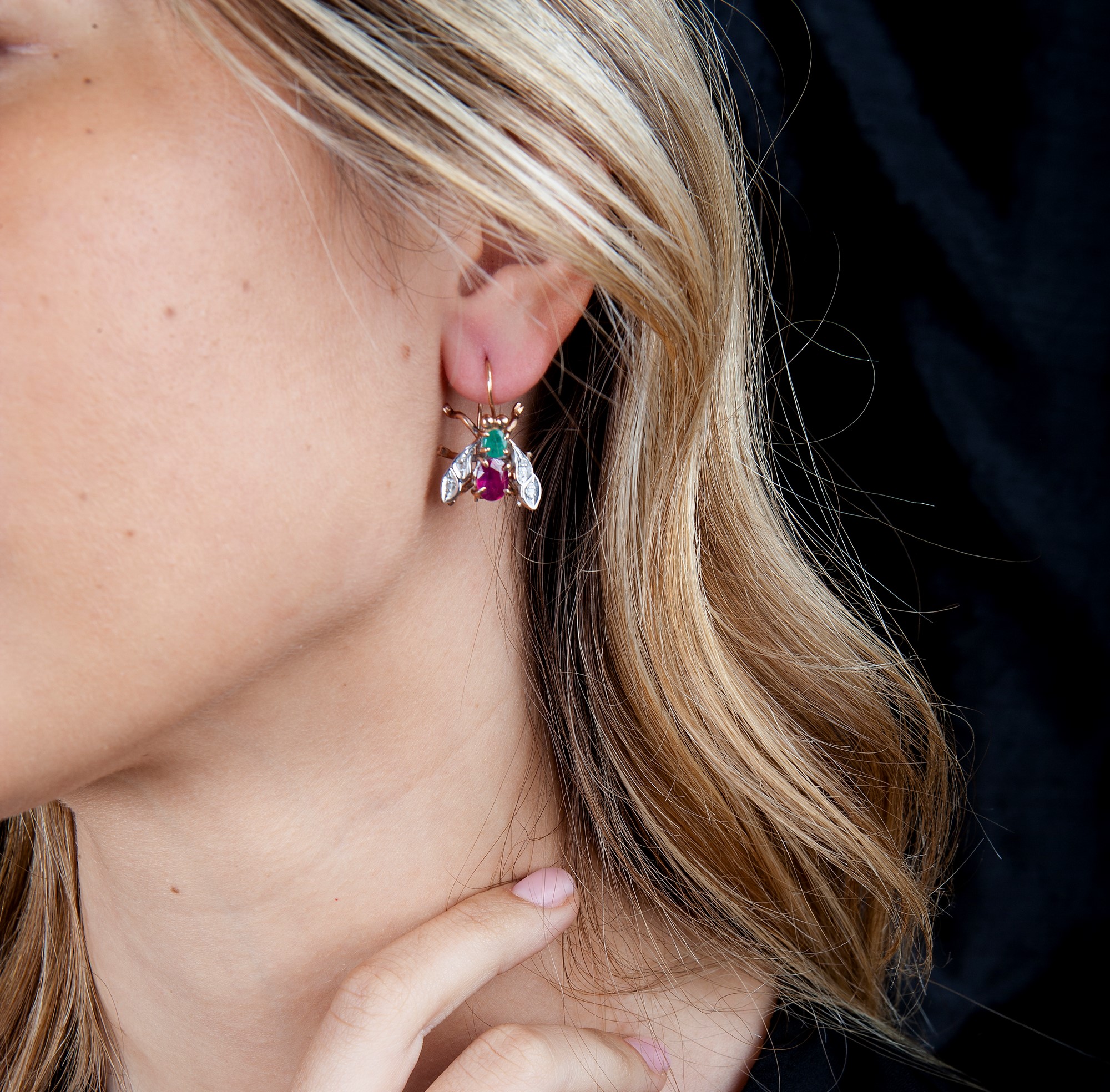 Orecchini a mosca in oro e argento, smeraldi, rubini e diamanti